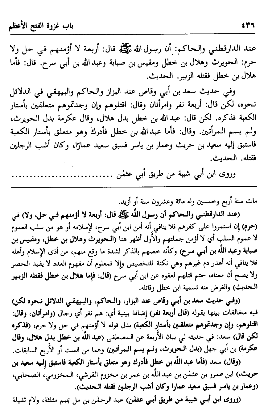وفي حديث سعد بن أبي وقاص عند البزاز والحاكم والبيهقي في الدلائل نحوه، لكن قال: أربعة نفر وامرأتان وقال: "اقتلوهم وإن وجدتموهم متعلقين بأستار الكعبة". فذكره. لكن قال: عبد الله بن خطل بدل هلال، وقال عكرمة بدل الحويرث، ولم يسم المرأتين. وقال: فأما عبد الله بن خطل فأدرك وهو متعلق بأستار الكعبة فاستبق إليه سعيد بن حريث وعمار بن ياسر فسبق سعيد عمارا، وكان أشب الرجلين فقتله. الحديث.