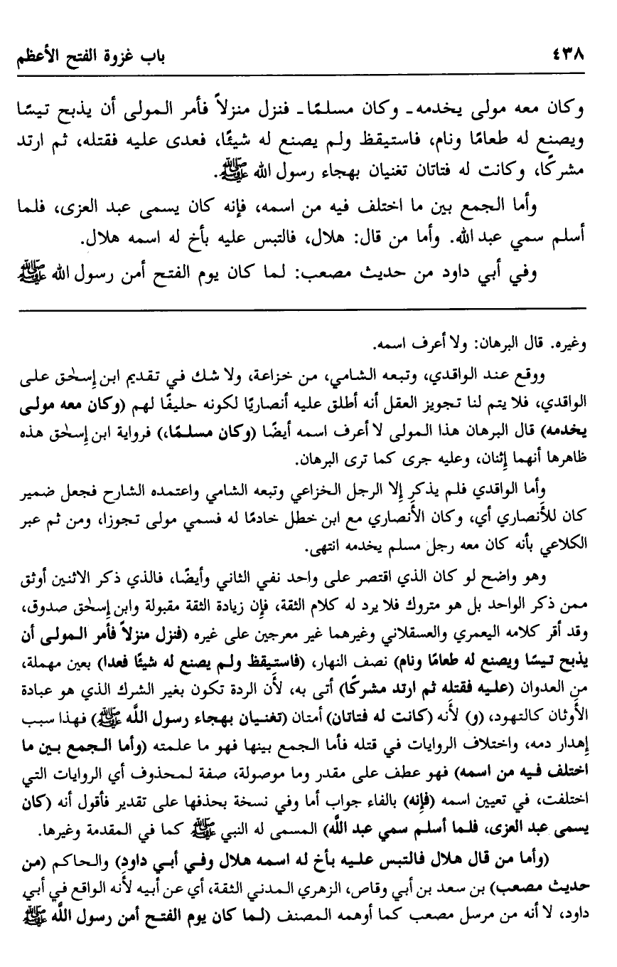 وأما الواقدي فلم يذكر إلا الرجل الخزاعي وتبعه الشامي واعتمده الشارح فجعل ضمير كان للأنصاري أي: وكان الأنصاري مع ابن خطل خادما له فسمي مولى تجوزا، ومن ثم عبر الكلاعي بأنه كان معه رجل مسلم يخدمه. انتهى.