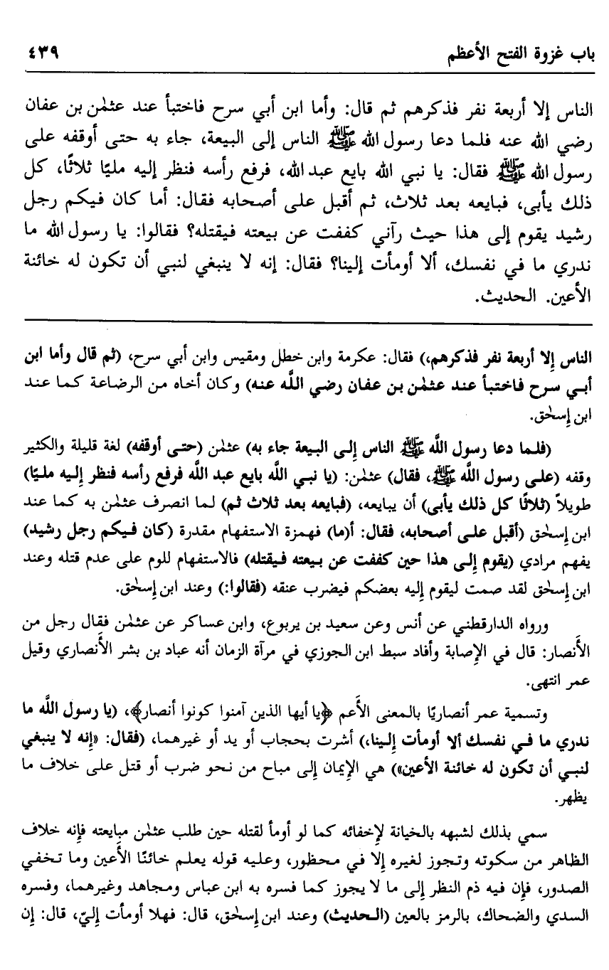 الناس إلا أربعة نفر فذكرهم ثم قال: وأما ابن أبي سرح فاختبأ عند عثمان بن عفان رضي الله عنه فلما دعا رسول الله صلى الله عليه وسلم الناس إلى البيعة، جاء به حتى أوقفه على رسول الله صلى الله عليه وسلم فقال: يا نبي الله بايع عبد الله، فرفع رأسه فنظر إليه مليا ثلاثا، كل ذلك يأبى، فبايعه بعد ثلاث، ثم أقبل على أصحابه فقال: "أما كان فيكم رجل رشيد يقوم إلى هذا حيث رآني كففت عن بيعته فيقتله"؟. فقالوا: يا رسول الله ما ندري ما في نفسك، ألا أومأت إلينا؟ فقال: "إنه لا ينبغي لنبي أن تكون له خائنة الأعين". الحديث.