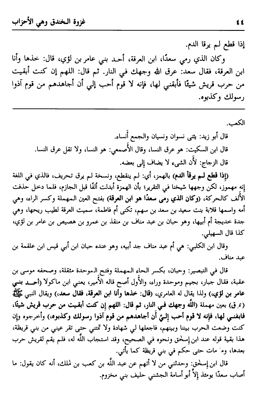 وكان الذي رمى سعدا، ابن العرقة، أحد بني عامر بني لؤي، قال: خذها وأنا ابن العرقة، فقال سعد: عرق الله وجهك في النار. ثم قال: اللهم إن كنت أبقيت من حرب قريش شيئا فأبقني لها، فإنه لا قوم أحب إلي أن أجاهدهم من قوم آذوا رسولك وكذبوه.
