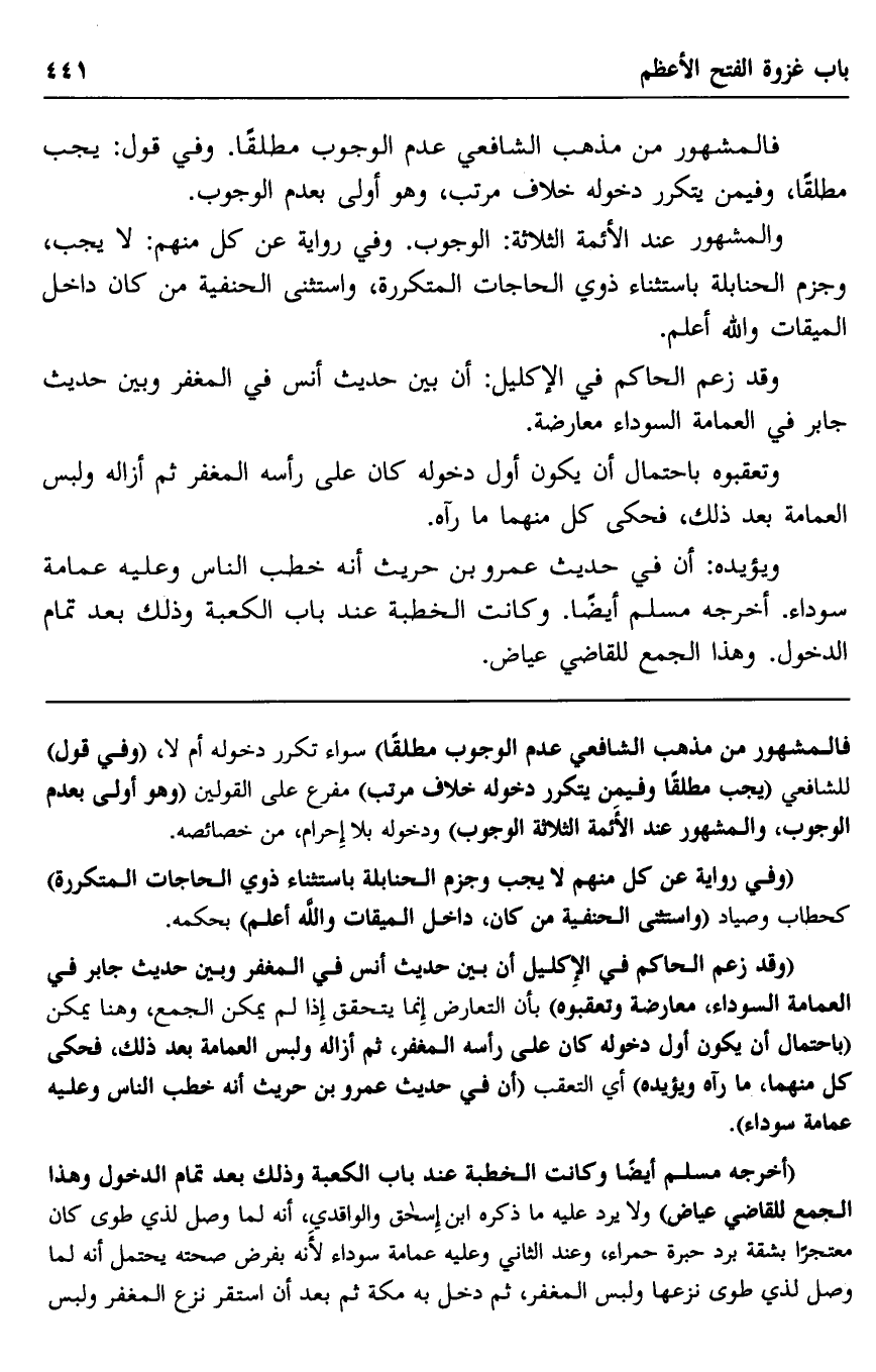 "أخرجه مسلم أيضا وكانت الخطبة عند باب الكعبة وذلك بعد تمام الدخول وهذا الجمع للقاضي عياض" ولا يرد عليه ما ذكره ابن إسحاق والواقدي، أنه لما وصل لذي طوى كان معتجرا بشقة برد حبرة حمراء، وعند الثاني وعليه عمامة سوداء لأنه بفرض صحته يحتمل أنه لما وصل لذي طوى نزعها ولبس المغفر، ثم دخل به مكة ثم بعد أن استقر نزع المغفر ولبس
