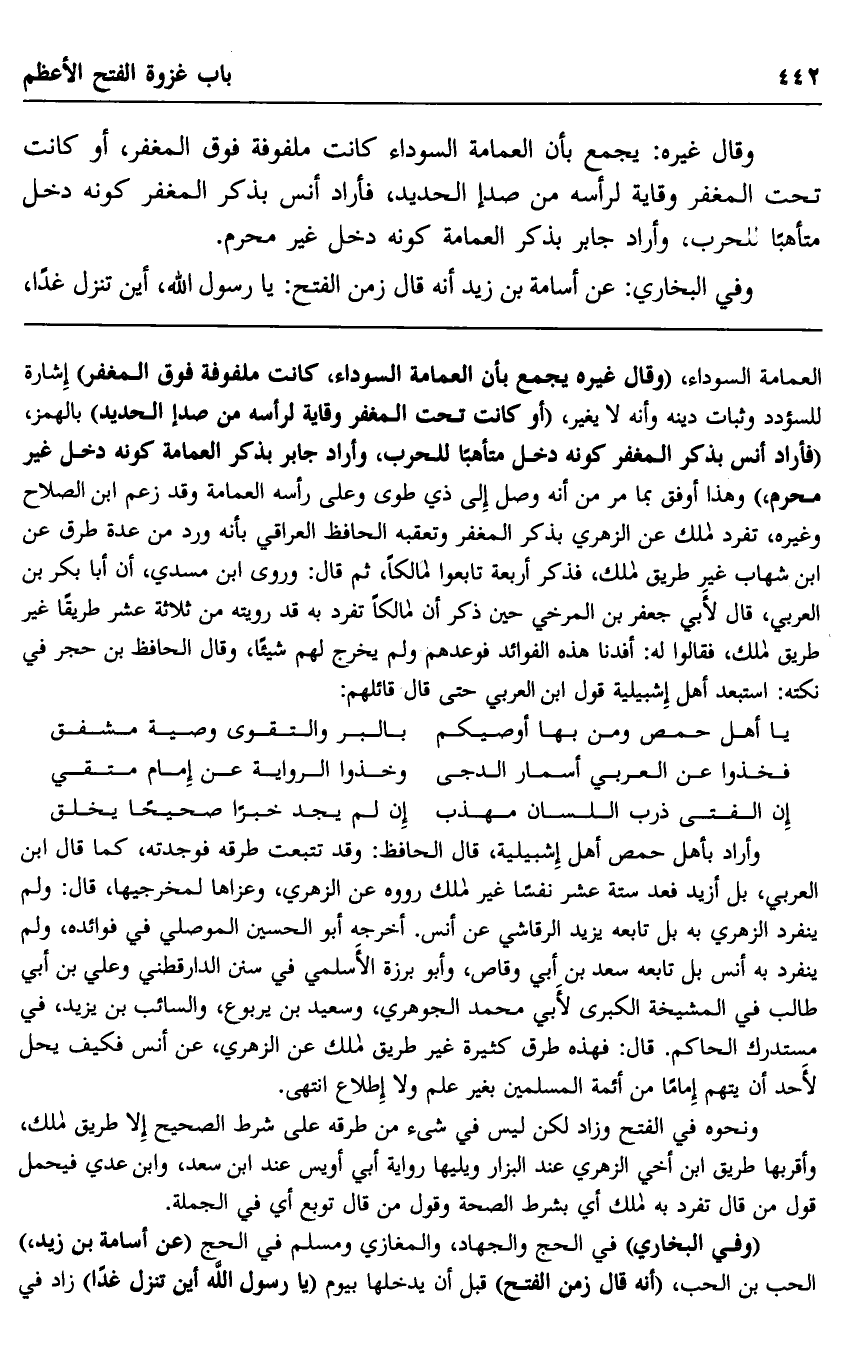 العمامة السوداء، "وقال غيره يجمع بأن العمامة السوداء، كانت ملفوفة فوق المغفر" إشارة للسؤدد وثبات دينه وأنه لا يغير، "أو كانت تحت المغفر وقاية لرأسه من صدإ الحديد" بالهمز، فأراد أنس بذكر المغفر كونه دخل متأهبا للحرب، وأراد جابر بذكر العمامة كونه دخل غير محرم،" وهذا أوفق بما مر من أنه وصل إلى ذي طوى وعلى رأسه العمامة وقد زعم ابن الصلاح وغيره، تفرد مالك عن الزهري بذكر المغفر وتعقبه الحافظ العراقي بأنه ورد من عدة طرق عن ابن شهاب غير طريق مالك، فذكر أربعة تابعوا مالكا، ثم قال: وروى ابن مسدي، أن أبا بكر بن العربي، قال لأبي جعفر بن المرخي حين ذكر أن مالكا تفرد به قد رويته من ثلاثة عشر طريقا غير طريق مالك، فقالوا له: أفدنا هذه الفوائد فوعدهم ولم يخرج لهم شيئا، وقال الحافظ بن حجر في نكته: استبعد أهل إشبيلية قول ابن العرجي حتى قال قائلهم: