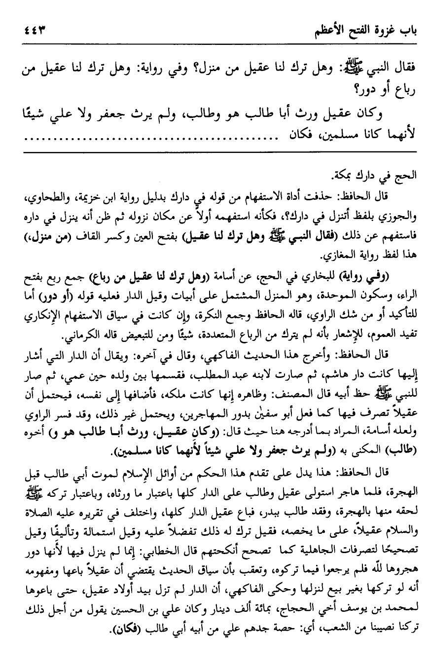 قال الحافظ: وأخرج هذا الحديث الفاكهي، وقال في آخره: ويقال: إن الدار التي أشار إليها كانت دار هاشم، ثم صارت لابنه عبد المطلب، فقسمها بين ولده حين عمي، ثم صار للنبي صلى الله عليه وسلم حظ أبيه, قال المصنف: وظاهره أنها كانت ملكه، فأضافها إلى نفسه، فيحتمل أن عقيلا تصرف فيها كما فعل أبو سفيان بدور المهاجرين، ويحتمل غير ذلك، وقد فسر الراوي ولعله أسامة، المراد بما أدرجه هنا حيث قال: "وكان عقيل، ورث أبا طالب هو و" أخوه "طالب" المكنى به "ولم يرث جعفر ولا علي شيئا لأنهما كانا مسلمين".
