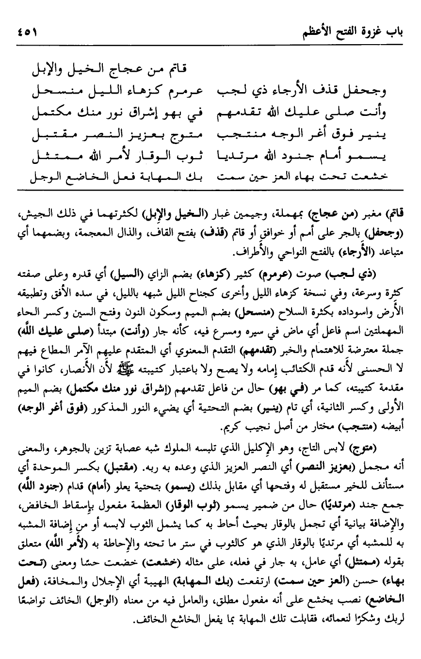 "ذي لجب" صوت "عرمرم" كثير "كزهاء" بضم الزاي "السيل" أي قدره وعلى صفته كثرة وسرعة، وفي نسخة كزهاء الليل وأخرى كجناح الليل شبهه بالليل، في سده الأفق وتطبيقه الأرض واسوداده بكثرة السلاح "منسحل" بضم الميم وسكون النون وفتح السين وكسر الحاء المهملتين اسم فاعل أي ماض في سيره ومسرع فيه، كأنه جار "وأنت" مبتدأ "صلى عليك الله" جملة معترضة للاهتمام والخبر "تقدمهم" التقدم المعنوي أي المتقدم عليهم الآمر المطاع فيهم لا الحسنى لأنه قدم الكتائب إمامة ولا يصح ولا باعتبار كتيبته صلى الله عليه وسلم لأن الأنصار، كانوا في مقدمة كتيبته، كما مر "في بهو" حال من فاعل تقدمهم "إشراق نور منك مكتمل" بضم الميم الأولى وكسر الثانية، أي تام "ينير" بضم التحتية أي يضيء النور المذكور "فوق أغر الوجه" أبيضه "منتجب" مختار من أصل نجيب كريم.
