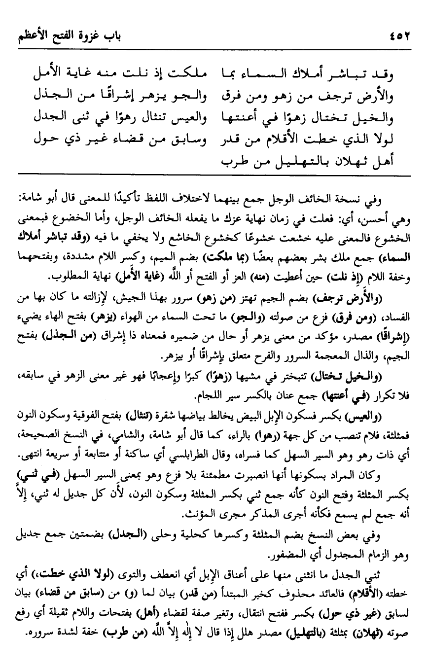 "والأرض ترجف" بضم الجيم تهتز "من زهو" سرور بهذا الجيش، لإزالته ما كان بها من الفساد، "ومن فرق" فزع من صولته ""والجو" ما تحت السماء من الهواء "يزهر" بفتح الهاء يضيء "إشراقا" مصدر، مؤكد من معنى يزهر أو حال من ضميره فمعناه ذا إشراق "من الجذل" بفتح الجيم، والذال المعجمة السرور والفرح متعلق بإشراقا أو بيزهر.