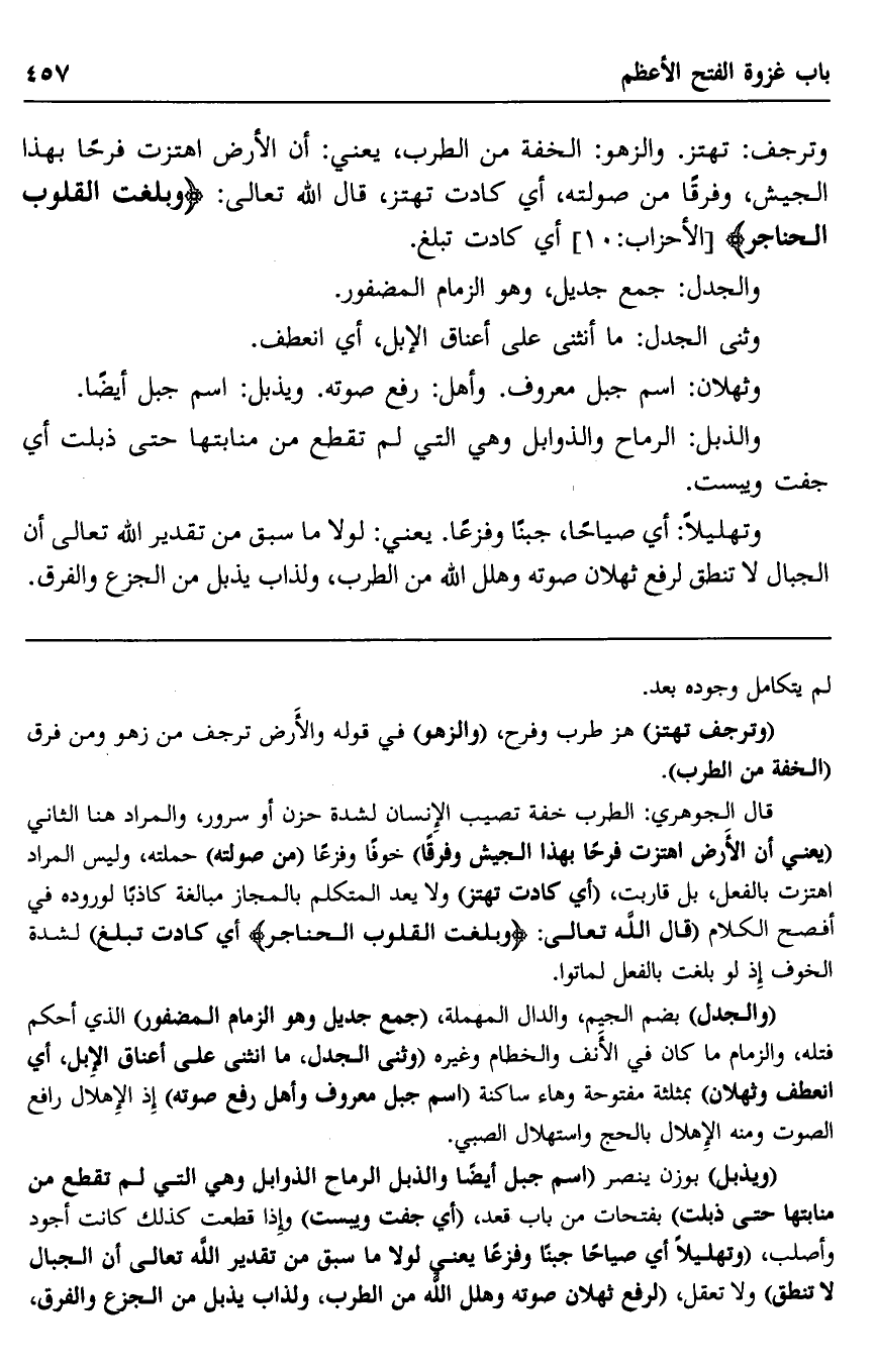 وترجف: تهتز. والزهو: الخفة من الطرب، يعني: أن الأرض اهتزت فرحا بهذا الجيش، وفرقا من صولته، أي كادت تهتز، قال الله تعالى: {وَبَلَغَتِ الْقُلُوبُ الْحَنَاجِرَ} [الأحزاب: 10] أي كادت تبلغ.