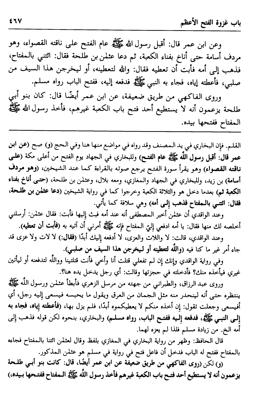 وعن ابن عمر قال: أقبل رسول الله صلى الله عليه وسلم عام الفتح على ناقته القصواء، وهو مردف أسامة حتى أناخ بفناء الكعبة، ثم دعا عثمان بن طلحة فقال: "ائتني بالمفتاح"، فذهب إلى أمه فأبت أن تعطيه فقال: والله لتعطينه، أو ليخرجن هذا السيف من صلبي، فأعطته إياه، فجاء به النبي صلى الله عليه وسلم فدفعه إليه، ففتح الباب. رواه مسلم.