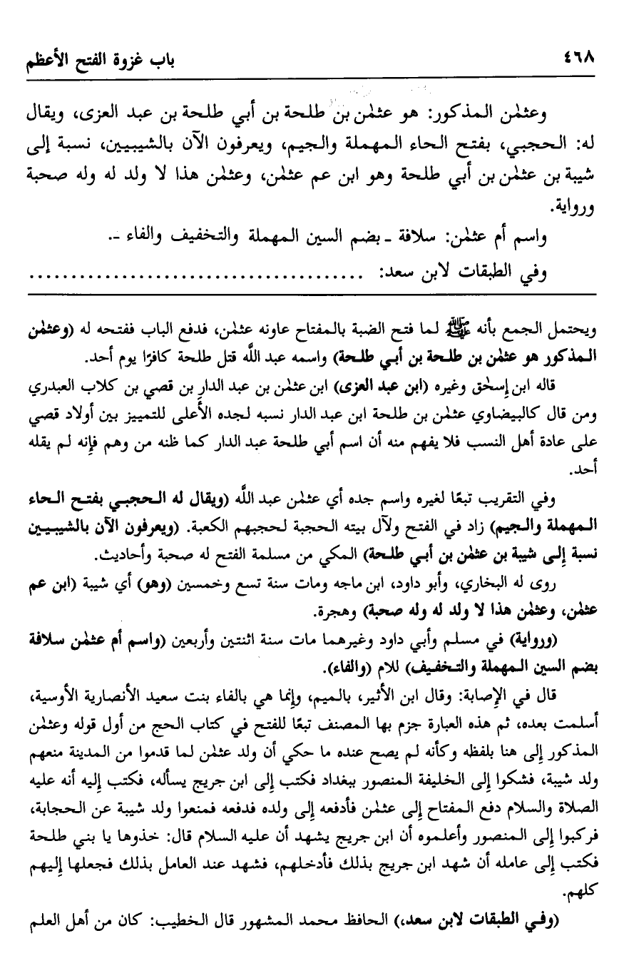 وعثمان المذكور: هو عثمان بن طلحة بن أبي طلحة بن عبد العزى، ويقال له: الحجبي، بفتح الحاء المهملة والجيم، ويعرفون الآن بالشيبيين، نسبة إلى شيبة بن عثمان بن أبي طلحة وهو ابن عم عثمان، وعثمان هذا لا ولد له وله صحبة ورواية.