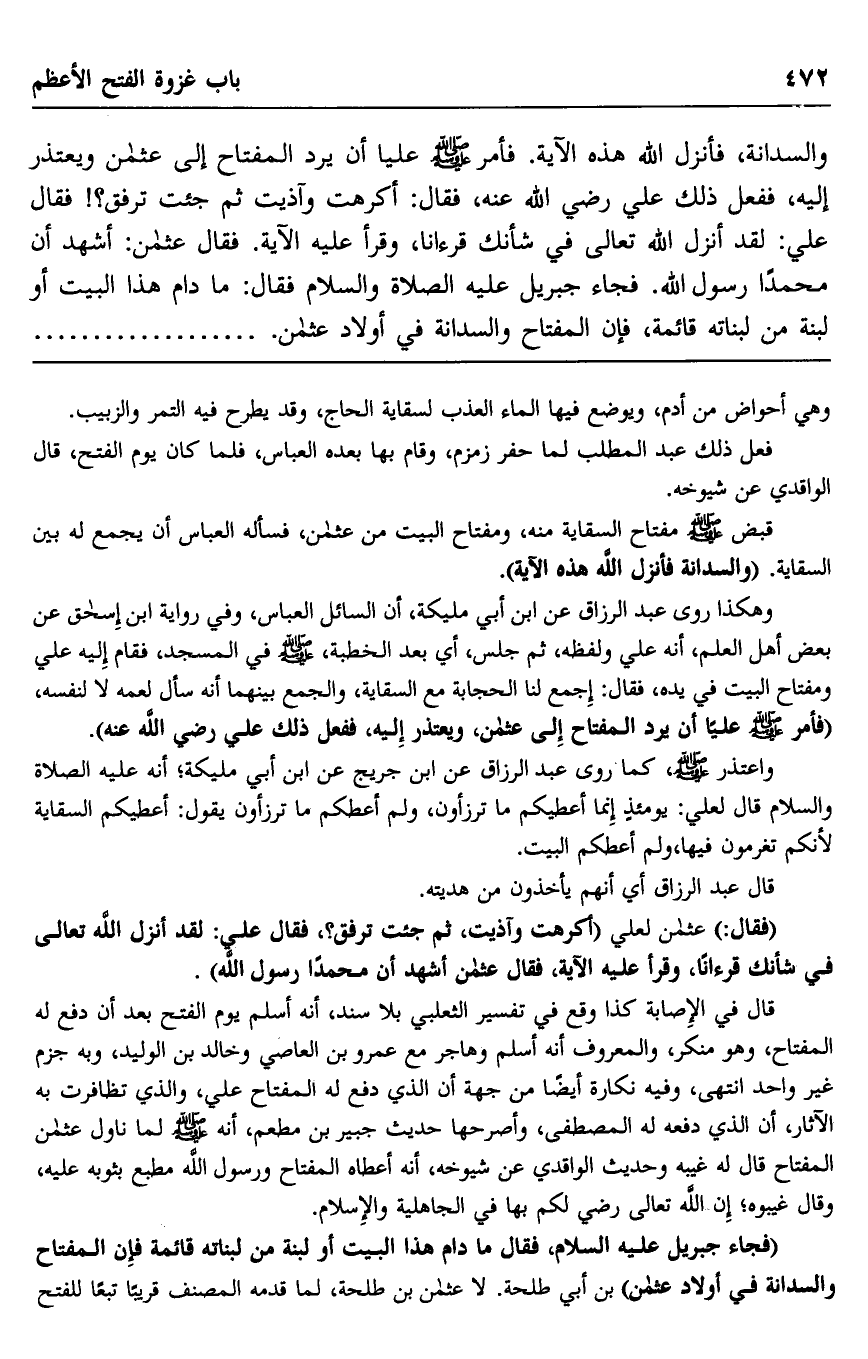 "فجاء جبريل عليه السلام، فقال ما دام هذا البيت أو لبنة من لبناته قائمة فإن المفتاح والسدانة في أولاد عثمان" بن أبي طلحة: لا عثمان بن طلحة، لما قدمه المصنف قريبا تبعا للفتح