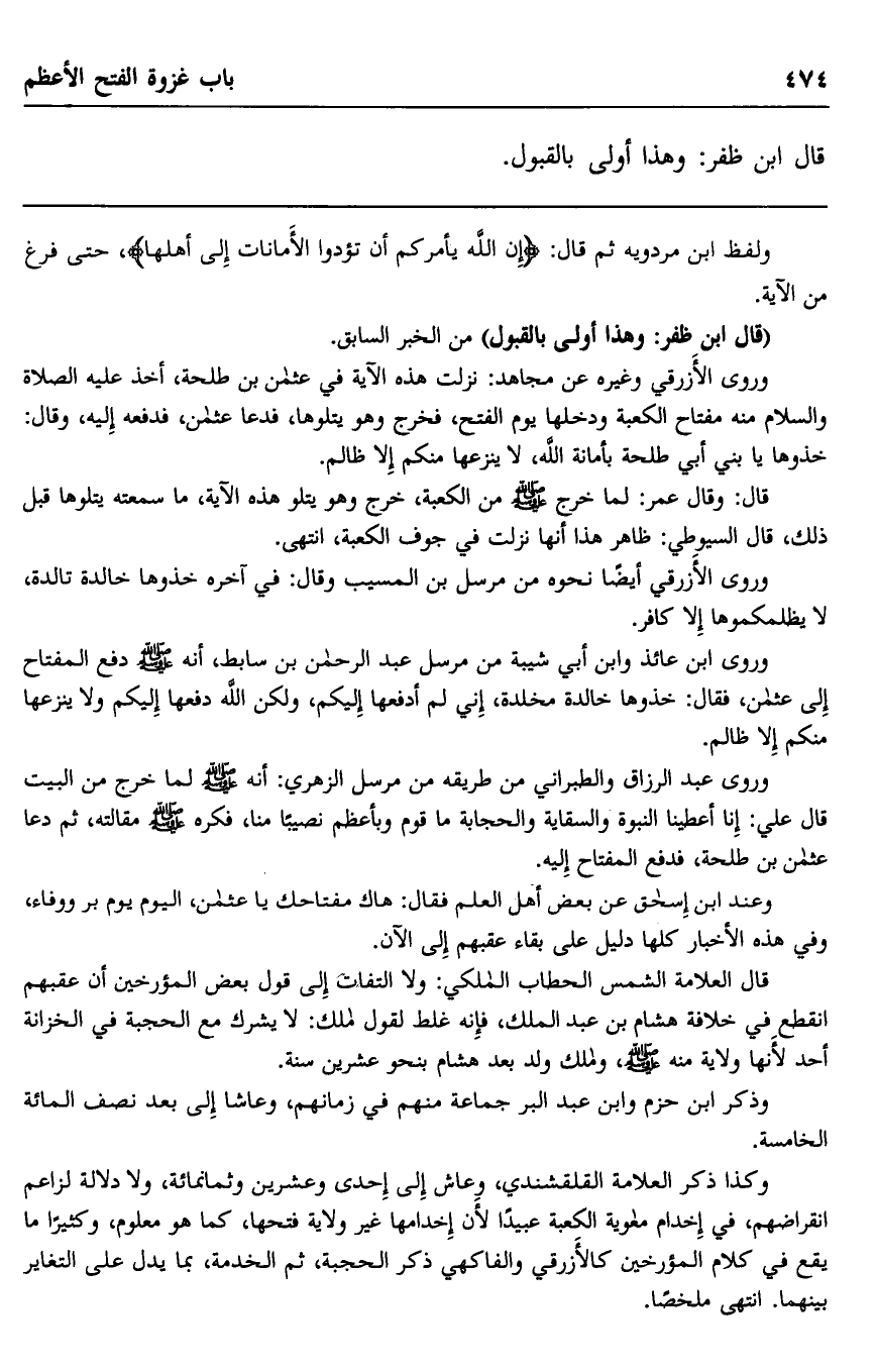 وكذا ذكر العلامة القلقشندي، وعاش إلى إحدى وعشرين وثمانمائة، ولا دلالة لزاعم انقراضه، في إخدام معاوية الكعبة عبيدا لأن إخدامها غير ولاية فتحها، كما هو معلوم، وكثيرا ما يقع في كلام المؤرخين كالأزرقي والفاكهي ذكر الحجبة، ثم الخدمة، بما يدل على التغاير بينهم. انتهى ملخصا.