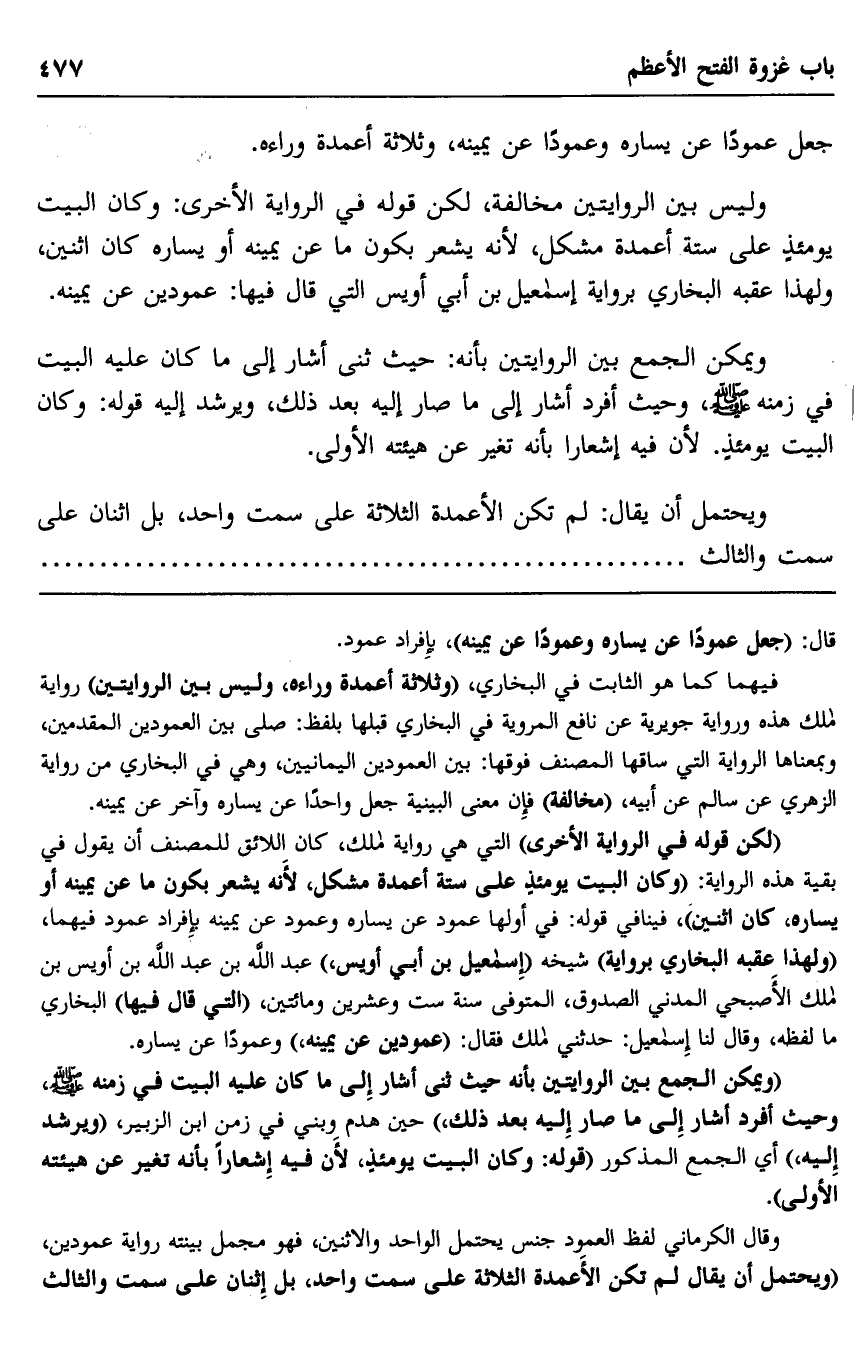 وقال الكرماني لفظ العمود جنس يحتمل الواحد الاثنين، فهو مجمل بينته رواية عمودين، "ويحتمل أن يقال لم تكن الأعمدة الثلاثة على سمت واحد، بل اثنان على سمت والثالث
