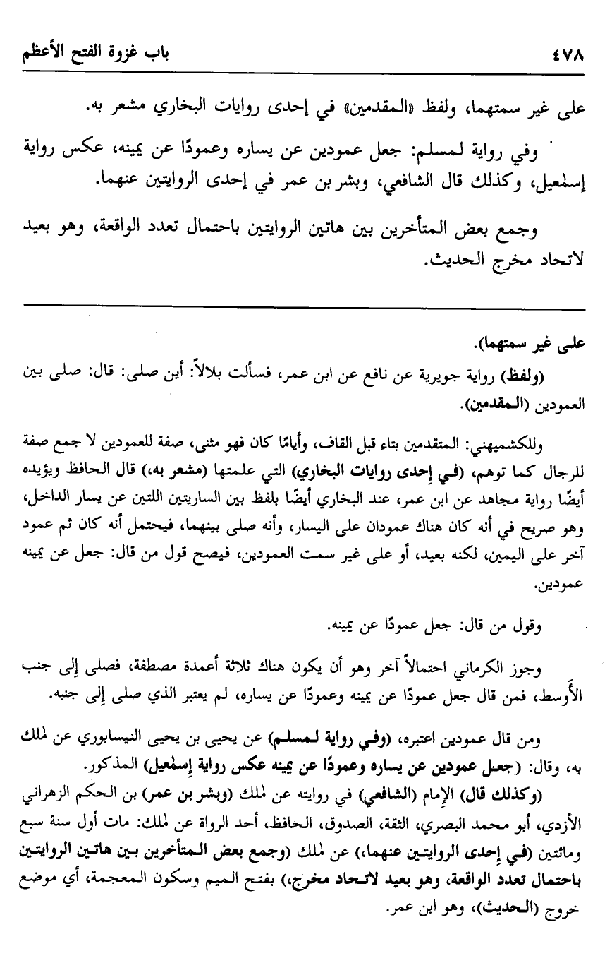 ومن قال عمودين اعتبره "في رواية لمسلم" عن يحيى بن يحيى النيسابوري عن مالك به، وقال "جعل عمودين عن يساره وعمودا عن يمينه عكس رواية إسماعيل" المذكور.