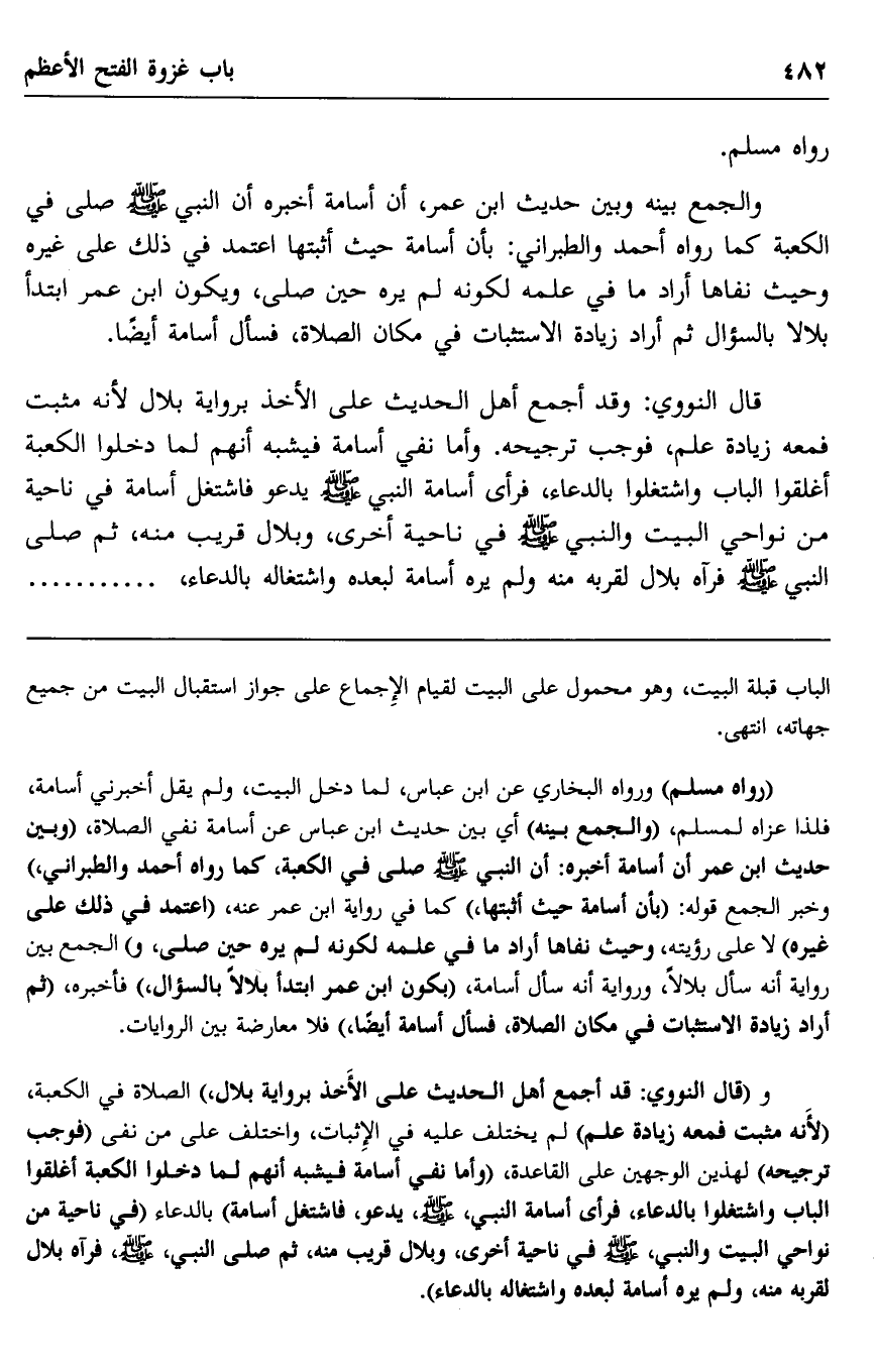 "رواه مسلم" ورواه البخاري عن ابن عباس، لما دخل البيت، ولم يقل: أخبرني أسامة، فلذا عزاه لمسلم، "والجمع بينه" أي بين حديث ابن عباس عن أسامة نفي الصلاة، "وبين حديث ابن عمر أن أسامة أخبره: أن النبي صلى الله عليه وسلم صلى في الكعبة، كما رواه أحمد والطبراني", وخبر الجمع قوله: "بأن أسامة حيث أثبتها" كما في رواية ابن عمر عنه، "اعتمد في ذلك على غيره" لا على رؤيته، وحيث نفاها أراد ما في علمه لكونه لم يره حين صلى، و"الجمع بين رواية: أنه سأل بلالا، ورواية: أنه سأل أسامة، "بكون ابن عمر ابتدأ بلالا بالسؤل", فأخبره، "ثم أراد زيادة الاستثبات في مكان الصلاة، فسأل أسامة أيضا", فلا معارضة بين الروايات.