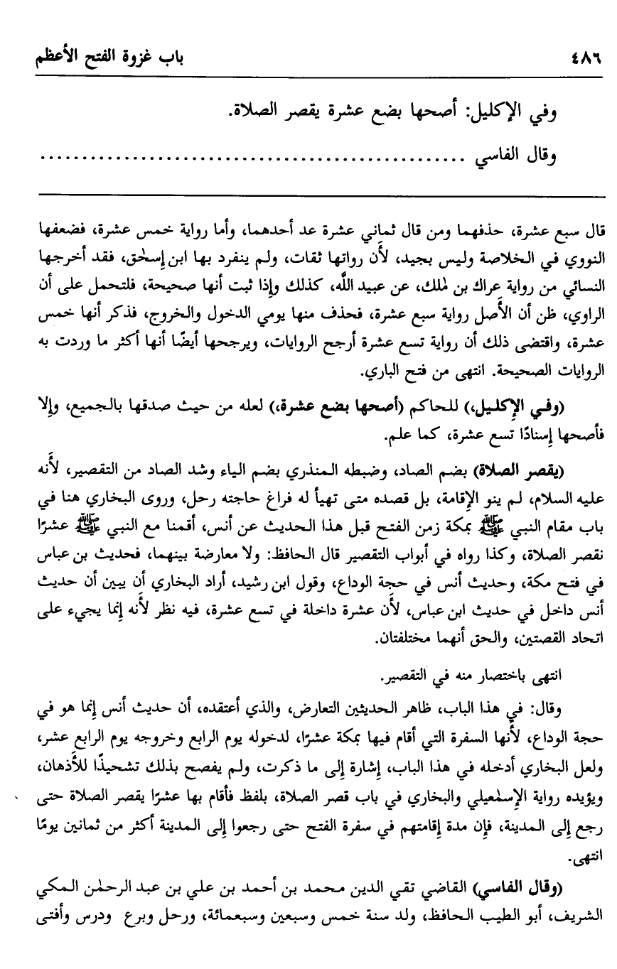 قال: سبع عشرة، حذفهما ومن قال: ثماني عشرة عد أحدهما، وأما رواية خمس عشرة، فضعفها النووي في الخلاصة وليس بجيد؛ لأن رواتها ثقات، ولم ينفرد بها ابن إسحاق، فقد أخرجها النسائي من رواية عراك بن مالك، عن عبيد الله كذلك وإذا ثبت أنها صحيحة، فلتحمل على أن الراوي ظن أن الأصل رواية سبع عشرة، فحذف منها يومي الدخول والخروج، فذكر أنها خمس عشرة، واقتضى ذلك أن رواية تسع عشرة أرجح الروايات، ويرجحها أيضا أنها أكثر ما وردت به الروايات الصحيحة. انتهى من فتح الباري.