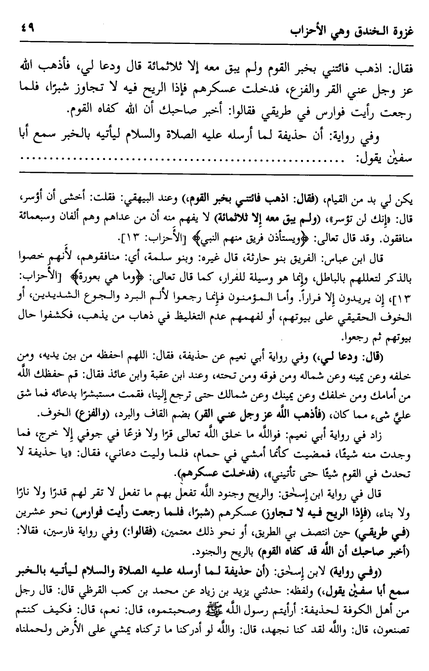 يكن لي بد من القيم "فقال: اذهب فائتني بخبر القوم" وعند البيهقي: فقلت: أخشى أن أؤسر، قال: "إنك لن تؤسر" "ولم يبق معه إلا ثلاثمائة" لا يفهم منه أن من عداهم وهم ألفان وسبعمائة منافقون. وقد قال تعالى: {وَيَسْتَأْذِنُ فَرِيقٌ مِنْهُمُ النَّبِيَّ} [الأحزاب: 13] .