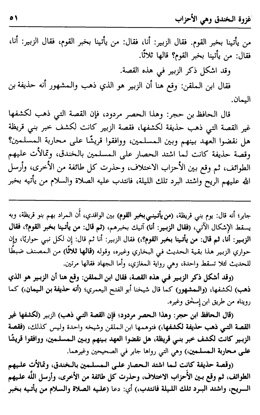 "قال الحافظ ابن حجر: وهذا الحصر مردود، فإن القصة التي ذهب" الزبير "لكشفها غير القصة التي ذهب حذيفة لكشفها" فتوهمها ابن الملقن وشيخه واحدة وليس كذلك، "فقصة الزبير كانت لكشف خبر بني قريظة، هل نقضوا العهد بينهم وبين المسلمين، ووافقوا قريشا على محاربة المسلمين" وهي التي رواها جابر في الصحيحين وغيرهما.
