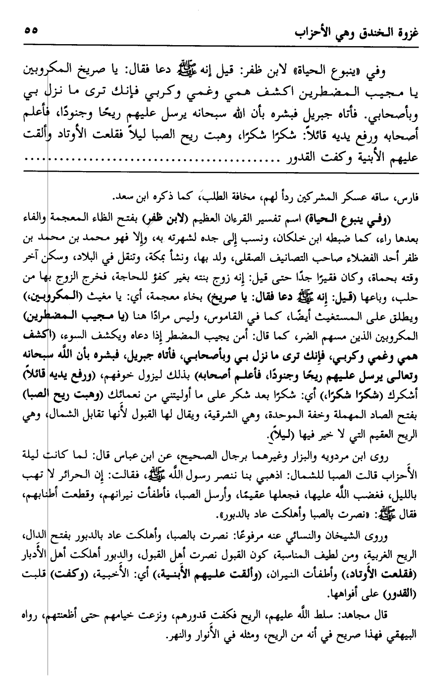 "وفي ينبوع الحياة" اسم تفسير القرءان العظيم "لابن ظفر" بفتح الظاء المعجمة والفاء بعدها راء، كما ضبطه ابن خلكان، ونسب إلى جده لشهرته به، وإلا فهو محمد بن محمد بن ظفر أحد الفضلاء صاحب التصانيف الصقلى، ولد بها، ونشأ بمكة، وتنقل في البلاد، وسكن آخر وقته بحماة، وكان فقيرا جدا حتى قيل: إنه زوج بنته بغير كفؤ للحاجة، فخرج الزوج بها من حلب، وباعها "قيل: إنه صلى الله عليه وسلم دعا فقال: "يا صريخ" بخاء معجمة، أي: يا مغيث "المكروبين"، ويطلق على المستغيث أيضا, كما في القاموس, وليس مرادا هنا "يا مجيب المضطرين" المكروبين الذي مسهم الضر، كما قال: أمن يجيب المضطر إذا دعاه ويكشف السوء "اكشف همي وغمي وكربي، فإنك ترى ما نزل بي وبأصحابي، فأتاه جبريل فبشره بأن الله سبحانه وتعالى يرسل عليهم ريحا وجنودا، فأعلم أصحابه" بذلك ليزول خوفهم، "ورفع يديه قائلا" أشكرك "شكرا شكرا" أي: شكرا بعد شكر على ما أوليتني من نعمائك "وهبت ريح الصبا" بفتح الصاد المهملة وخفة الموحدة، وهي الشرقية، ويقال لها القبول؛ لأنها تقابل الشمال، وهي الريح العقيم التي لا خير فيها "ليلا".