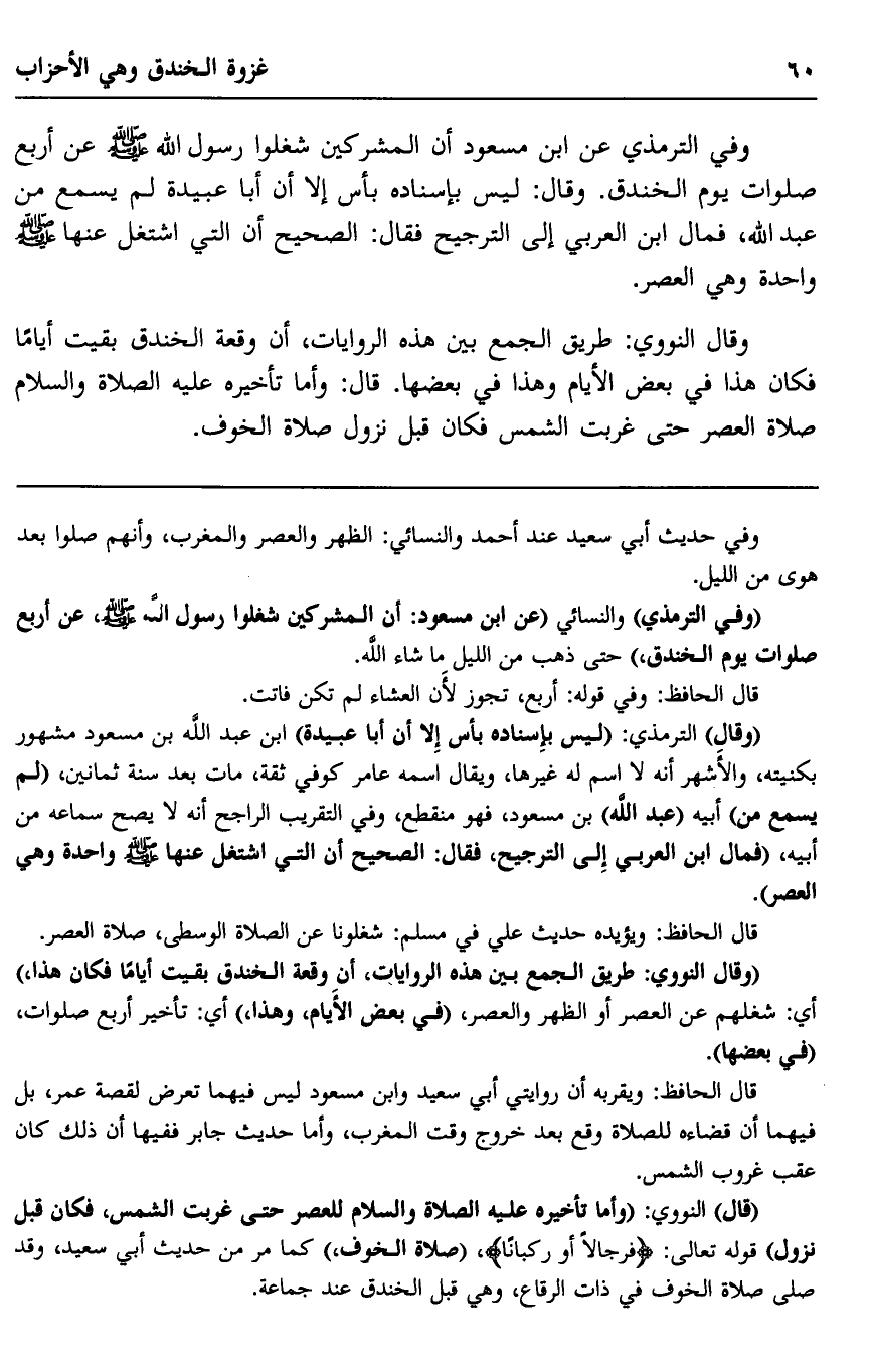 وفي الترمذي عن ابن مسعود أن المشركين شغلوا رسول الله صلى الله عليه وسلم عن أربع صلوات يوم الخندق. وقال: ليس بإسناده بأس إلا أن أبا عبيدة لم يسمع من عبد الله، فمال ابن العربي إلى الترجيح فقال: الصحيح أن التي اشتغل عنها صلى الله عليه وسلم واحدة وهي العصر.