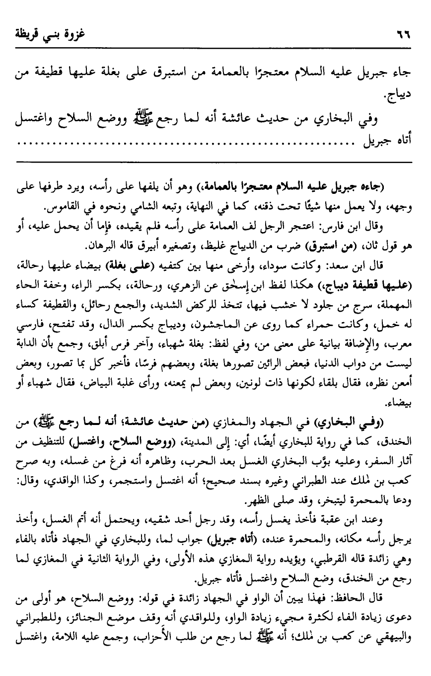قال الحافظ: فهذا يبين أن الواو في الجهاد زائدة في قوله: ووضع السلاح، هو أولى من دعوى زيادة الفاء لكثرة مجيء زيادة الواو، وللواقدي أنه وقف موضع الجنائز، وللطبراني والبيهقي عن كعب بن مالك، أنه صلى الله عليه وسلم لما رجع من طلب الأحزاب، وجمع عليه اللامة، واغتسل