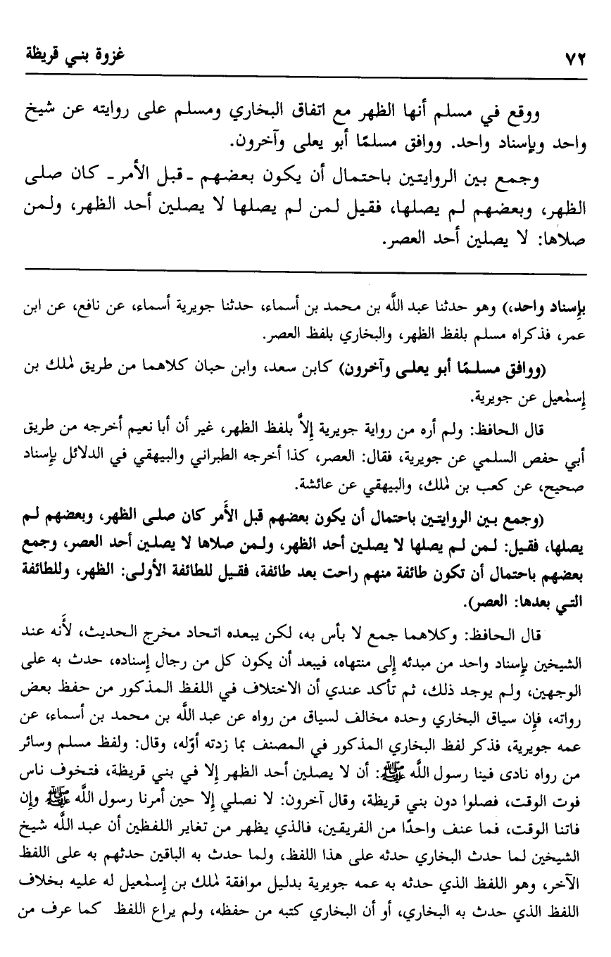 قال الحافظ: وكلاهما جمع لا بأس به، لكن يبعده اتحاد مخرج الحديثح لأنه عند الشيخين بإسناد واحد من مبدئه إلى منتهاه، فيبعد أن يكون كل من رجال إسناده، حدث به على الوجهين، ولم يوجد ذلك، ثم تأكد عندي أن الاختلاف في اللفظ المذكور من حفظ بعض رواته، فإن سياق البخاري وحده مخالف لسياق من رواه عن عبد الله بن محمد بن أسماء، عن عمه جويرية، فذكر لفظ البخاري المذكور في المصنف بما زدته أوله، وقال: ولفظ مسلم وسائر من رواه نادى فينا رسول الله صلى الله عليه وسلم: "أن لا يصلين أحد الظهر إلا في بني قريظة"، فتخوف ناس فوت الوقت، فصلوا دون بني قريظة، وقال آخرون: لا نصلي إلا حين أمرنا رسول الله صلى الله عليه وسلم وإن فاتنا الوقت، فما عنف واحدا من الفريقين، فالذي يظهر من تغاير اللفظين أن عبد الله شيخ الشيخين لما حدث البخاري حدثه على هذا اللفظ، ولما حدث به الباقين حدثهم به على اللفظ الآخر، وهو اللفظ الذي حدثه به عمه جويرية بدليل موافقة مالك بن إسماعيل له عليه بخلاف اللفظ الذي حدث به البخاري، أو أن البخاري كتبه من حفظه، ولم يراع اللفظ كما عرف من