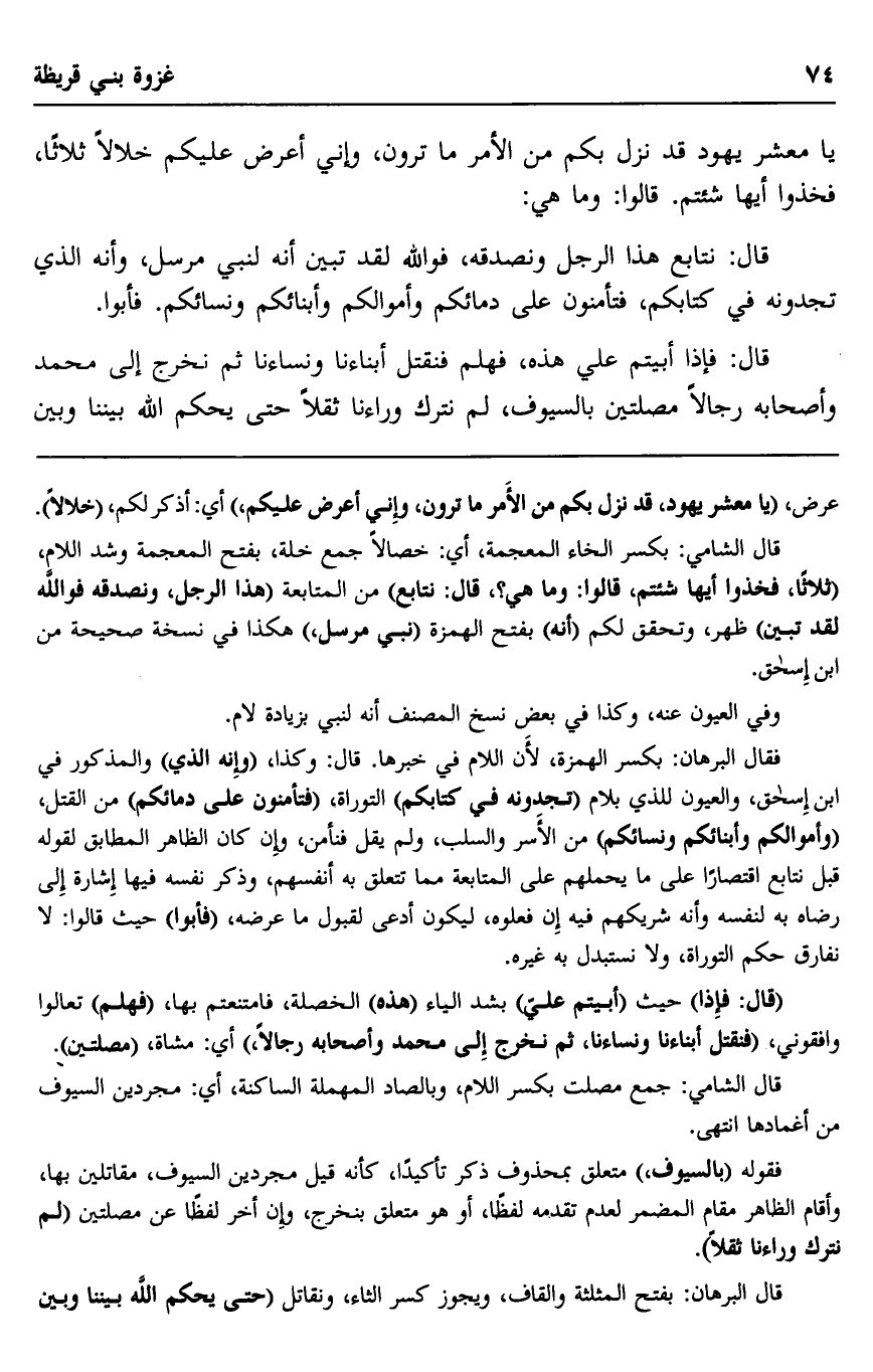 يا معشر يهود قد نزل بكم من الأمر ما ترون، وإني أعرض عليكم خلالا ثلاثا، فخذوا أيها شئتم. قالوا: وما هي: