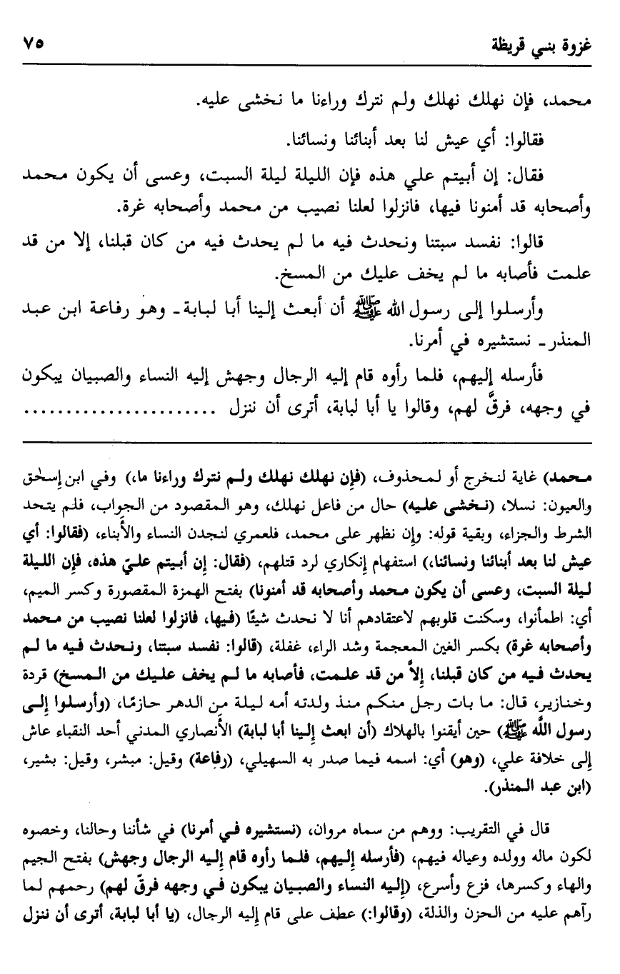 محمد" غاية لنخرج أو لمحذوف، "فإن نهلك نهلك ولم نترك وراءنا ما" وفي ابن إسحاق والعيون: نسلا، "نخشى عليه" حال من فاعل نهلك، وهو المقصود من الجواب، فلم يتحد الشرط والجزاء وبقية قوله: وإن نظهر على محمد، فلعمري لنجدن النساء والأبناء "فقالوا: أي عيش لنا بعد أبنائنا ونسائنا" استفهام إنكاري لرد قتلهم "فقال: إن أبيتم علي هذه، فإن الليلة ليلة السبت، وعسى أن يكون محمد وأصحابه قد أمنونا" بفتح الهمزة المقصورة وكسر الميم، أي: اطمأنوا، وسكنت قلوبهم لاعتقادهم أنا لا نحدث شيئا "فيها، فانزلوا لعلنا نصيب من محمد وأصحابه غرة" بكسر الغين المعجمة وشد الراء، غفلة، "قالوا: نفسد سبتنا، ونحدث فيه ما لم يحدث فيه من كان قبلنا، إلا من قد علمت، فأصابه ما لم يخف عليك من المسخ" قردة وخنازير، قال: ما بات رجل منكم منذ ولدته أمه ليلة من الدهر حازما، "وأرسلوا إلى رسول الله صلى الله عليه وسلم حين أيقنوا بالهلاك "أن ابعث إلينا أبا لبابة" الأنصاري المدني أحد النقباء عاش إلى خلافة علي، "وهو" أي: اسمه فيما صدر به السهيلي، "رفاعة" وقيل: مبشر، وقيل: بشير، "ابن عبد المنذر".