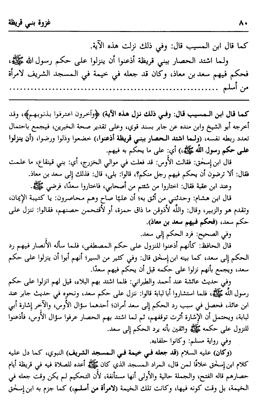 قال ابن هشام: وحدثني من أثق به، أن عليا صاح وهم محاصرون: يا كتيبة الإيمان، وتقدم هو والزبير، وقال: والله لأذوقن ما ذاق حمزة، أو لأقتحمن حصنهم، فقالوا: ننزل على حكم سعد، "فحكم فيهم سعد بن معاذ".