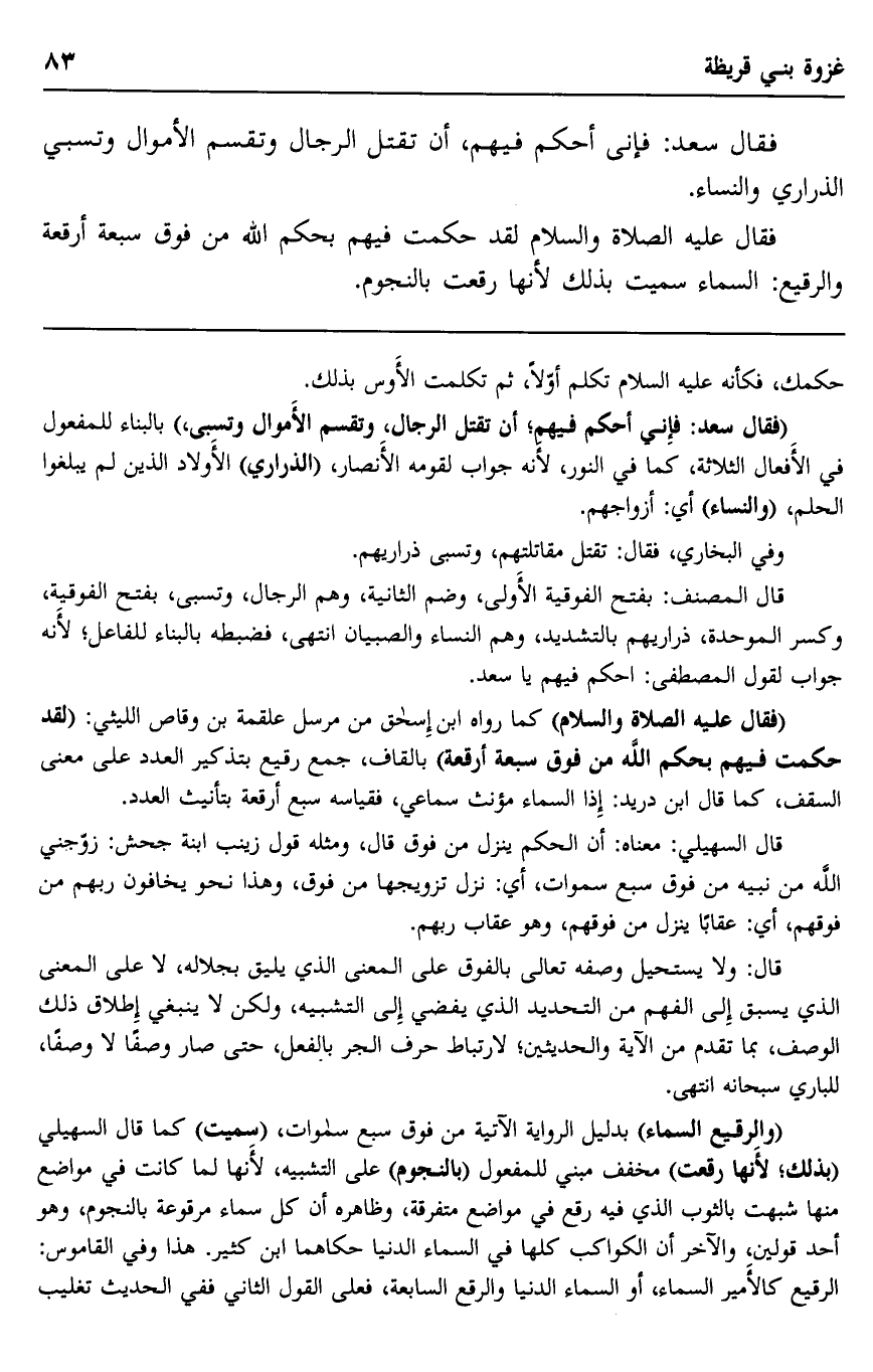 "فقال عليه الصلاة والسلام" كما رواه ابن إسحاق من مرسل علقمة بن وقاص الليثي: "لقد حكمت فيهم بحكم الله من فوق سبعة أرقعة" بالقاف، جمع رقيع بتذكير العدد على معنى السقف، كما قال ابن دريد: إذا السماء مؤنث سماعي، فقياسه سبع أرقعة بتأنيث العدد.
