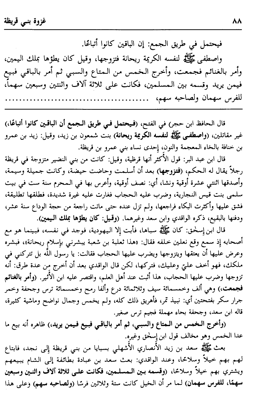 قال ابن إسحاق: كان صلى الله عليه وسلم سباها، فأبت إلا اليهودية، فوجد في نفسه، فبينما هو مع أصحابه إذ سمع وقع نعلين خلفه فقال: "هذا ثعلبة بن شعبة يبشرني بإسلام ريحانة" فبشره وعرض عليها أن يعتقها ويتزوجها ويضرب عليها الحجاب فقالت: يا رسول الله بل تتركني في ملكك، فهو أخف علي وعليك، فتركها، لكن قال الواقدي بعد أن أخرج من عدة طرق: أنه تزوجها وضرب عليها الحجاب، هذا أثبت عند أهل العلم، واقتصر عليه ابن الأثير. "وأمر بالغنائم فجمعت،" وهي ألف وخمسمائة سيف وثلاثمائة درع وألفا رمح وخمسمائة ترس وجحفة وخمر جرار سكر بفتحتين أي: نبيذ تمر، فأهريق ذلك كله، ولم يخمس وجمال نواضح وماشية كثيرة، قاله ابن سعد، وجحفة بحاء مهملة فجيم ترس صغير.