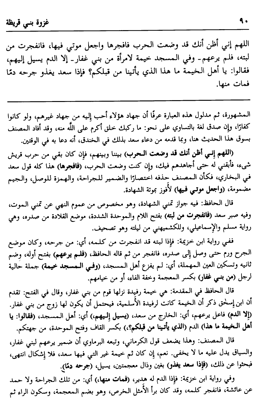 اللهم إني أظن أنك قد وضعت الحرب فافجرها واجعل موتي فيها، فانفجرت من لبته، فلم يرعهم -وفي المسجد خيمة لامرأة من بني غفار- إلا الدم يسيل إليهم، فقالوا: يا أهل الخيمة ما هذا الذي يأتينا من قبلكم؟ فإذا سعد يغذو جرحه دما فمات منها.