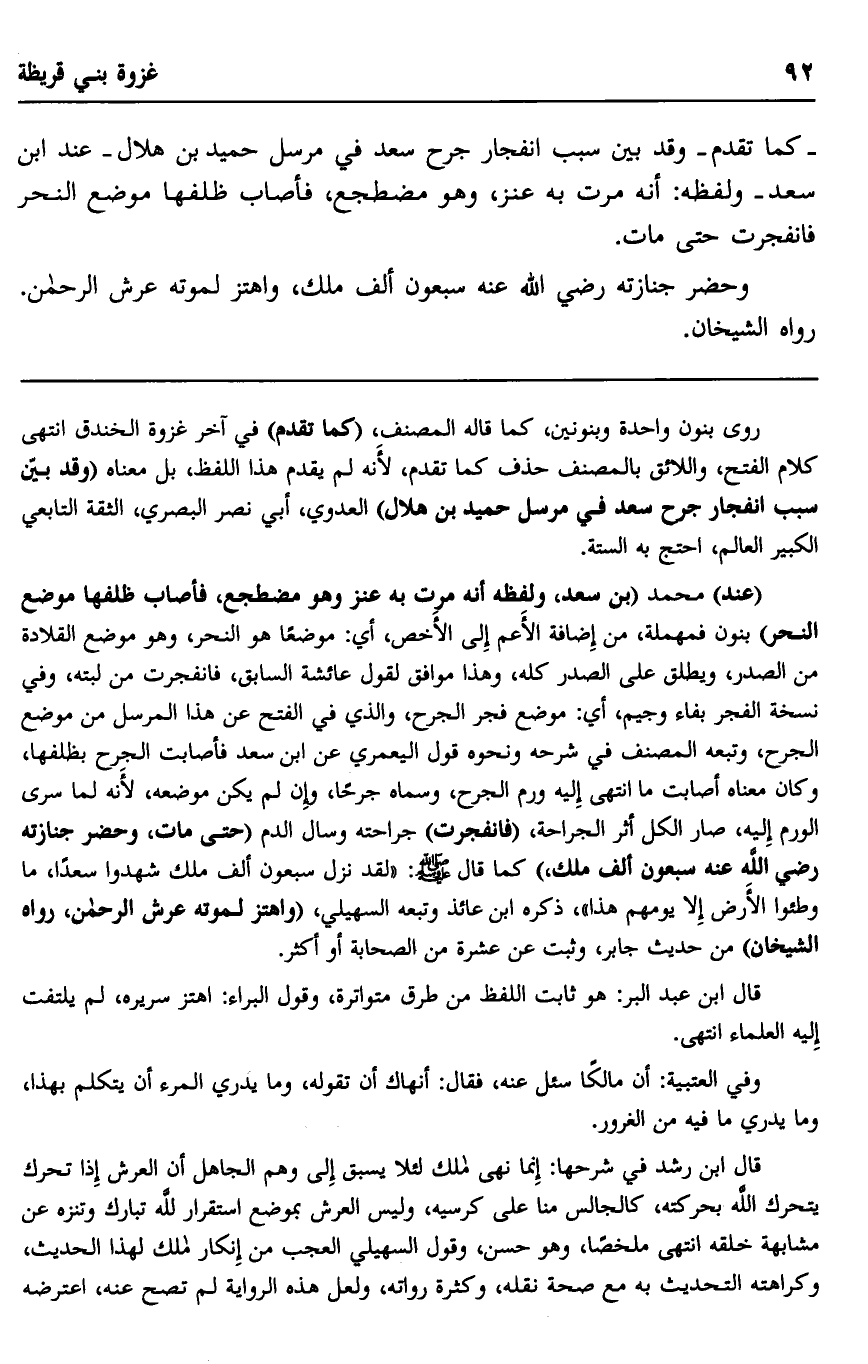 -كما تقدم- وقد بين سبب انفجار جرح سعد في مرسل حميد بن هلال -عند ابن سعد- ولفظه: أنه مرت به عنز، وهو مضطجع، فأصاب ظلفها موضع النحر فانفجرت حتى مات.