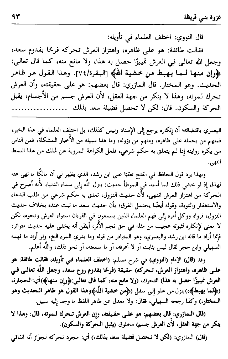 وبهذا يرد قول الحافظ في الفتح تعقبا على ابن رشد، الذي يظهر لي أن مالكا ما نهى عنه لهذا، إذ لو خشي ذلك لما أسند في الموطأ حديث: ينزل الله إلى سماء الدنيا؛ لأنه أصرح في الحركة من اهتزاز العرش ا. هـ؛ لأن حديث النزول، تعلق به حكم شرعي من طلب الدعاء والاستغفار والتوبة، وقوله أيضا يحتمل الفرق، بأن حديث سعد ما ثبت عنده بخلاف حديث النزول، فرواه ووكل أمره إلى فهم العلماء الذين يسمعون في القرءان استواء العرش ونحوه، لكن لا معنى لإنكاره لثبوته عجيب من مثله في حق نجم الأثر، أيظن أنه يخفى عليه حديث متواتر، فإنما أراد ما قاله ابن رشد واليعمري، وهو المتبادر من قوله وما يدري المرء إلخ، ولو أراد ما فهمه السهيلي وابن حجر لقال ليس بثابت أو لا أعرفه، أو ما سمعته، أو نحو ذلك، والله أعلم.