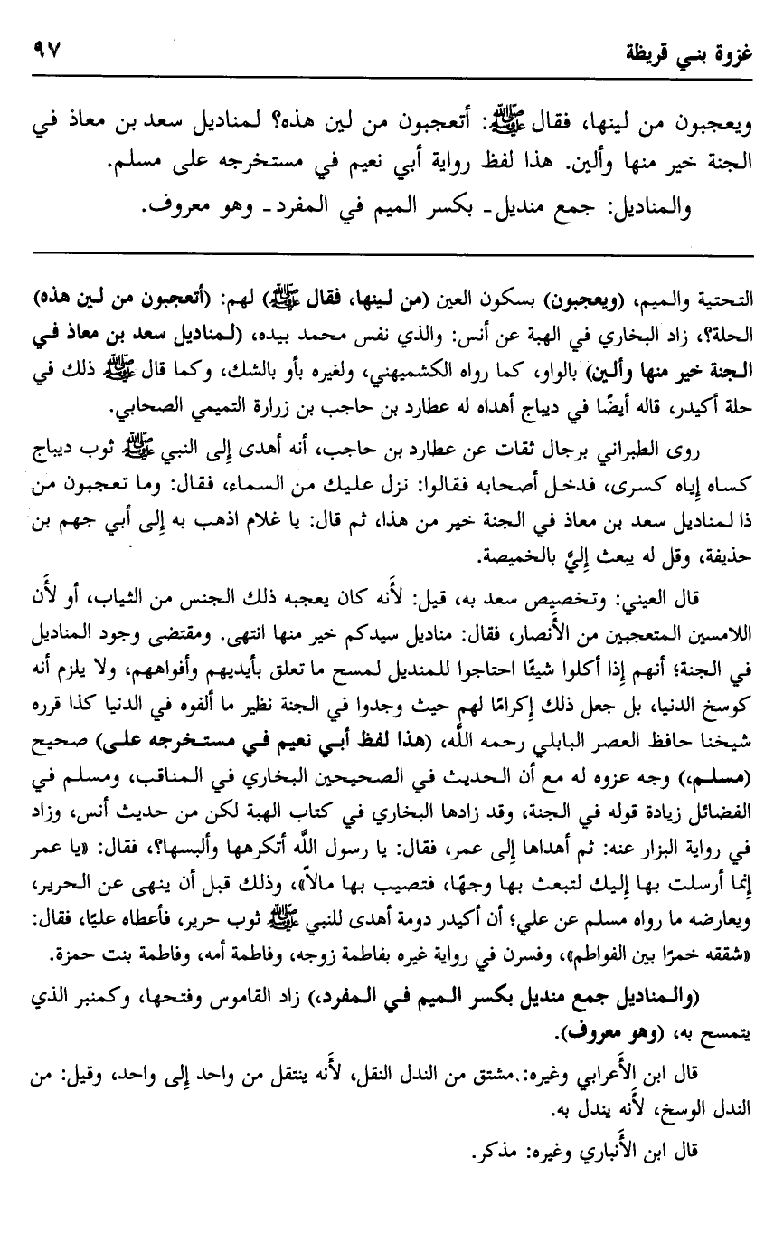 ويعجبون من لينها، فقال صلى الله عليه وسلم: "أتعجبون من لين هذه؟ لمناديل سعد بن معاذ في الجنة خير منها وألين". هذا لفظ رواية أبي نعيم في مستخرجه على مسلم.