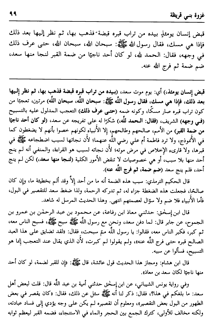 قبض إنسان يومئذ بيده من تراب قبره قبضة فذهب بها، ثم نظر إليها بعد ذلك فإذا هي مسك، فقثال رسول الله صلى الله عليه وسلم: "سبحان الله، سبحان الله"، حتى عرف ذلك في وجهه، فقال: "الحمد لله، لو كان أحد ناجيا من ضمة القبر لنجا منها سعد، ضم ضمة ثم فرج الله عنه".