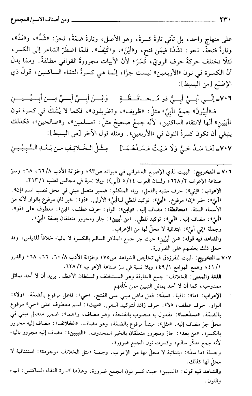 706 - التخريج: البيت لذي الإِصبع العدواني في ديوانه ص 93؛ وخزانة الأدب 8/ 66، 68؛ وسرّ صناعة الإعراب 2/ 628؛ ولسان العرب 14/ 5 (أبي)؛ وبلا نسبة في مجالس ثعلب 1/ 213.