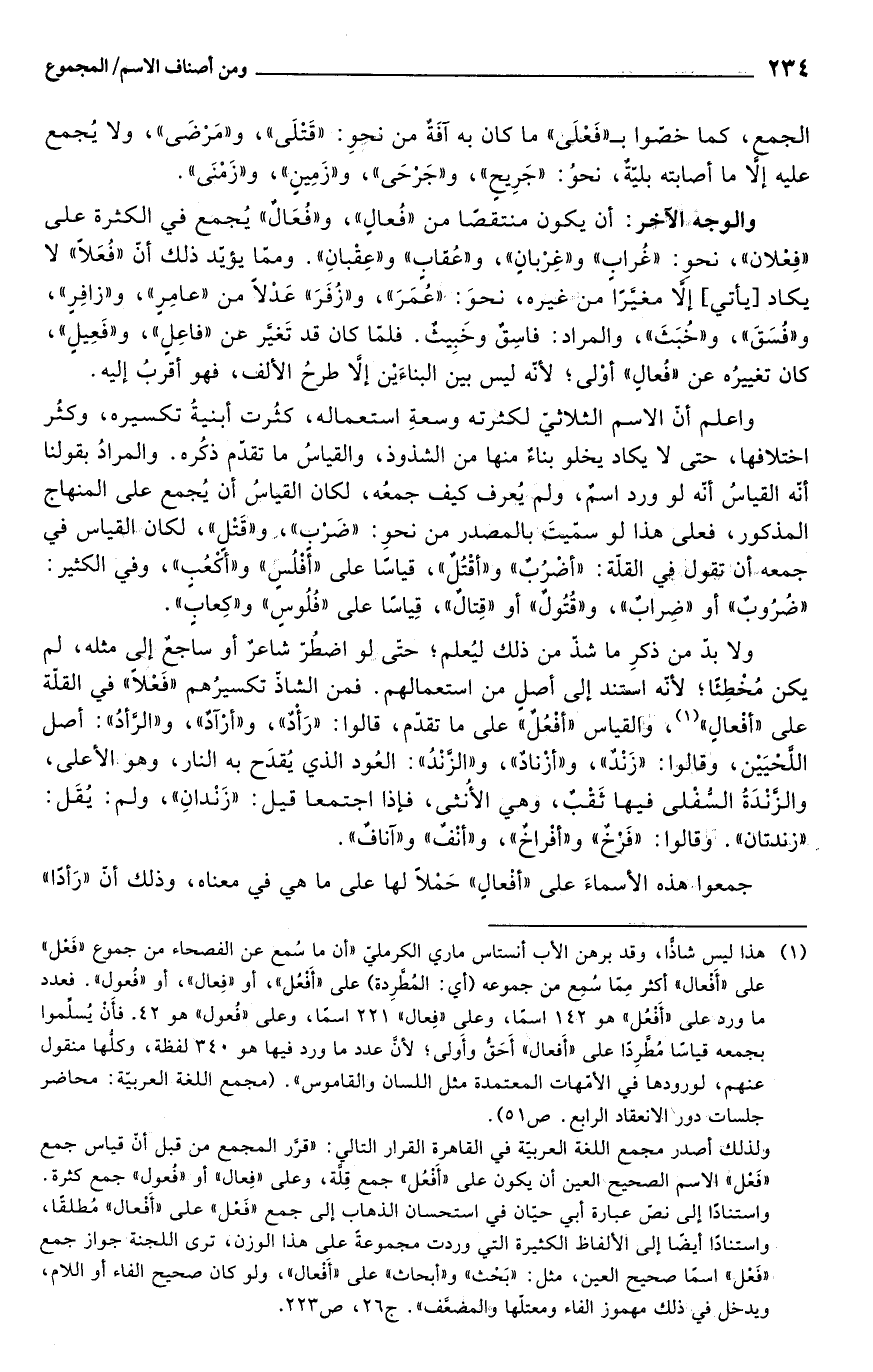 (¬1) هذا ليس شاذًا، وقد برهن الأب أنستاس ماري الكرمليّ "أن ما سُمع عن الفصحاء من جموع "فَعْل" على "أَفعال" أكثر مِمّا سُمِع من جموعه (أي: المُطَّرِدة) على "أَفْعُل"، أو"فِعال"، أو "فُعول". فعدد ما ورد على "أَفعُل" هو 142 اسمًا، وعلى "فِعال" 221 اسمًا، وعلى "فُعول" هو 42. فأَنْ يُسلّموا بجمعه قياسًا مُطَّرِدًا على "أَفعال" أَحَقُّ وأَولى؛ لأنَّ عدد ما ورد فيها هو 340 لفظة، وكلُّها منقول عنهم، لورودها في الأمّهات المعتمدة مثل اللسان والقاموس". (مجمع اللغة العربيّة: محاضر جلسات دور الانعقاد الرابع. ص 51).
