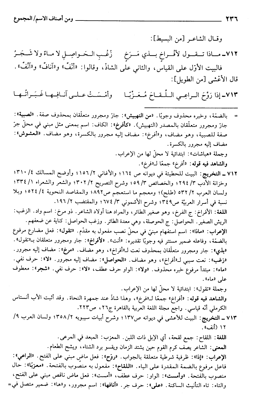 والشاهد فيه قوله: "أفراخ" جمعًا لـ"فرخ"، وهذا شاذّ عند جمهرة النحاة. وقد أثبت الأب أنستاس الكرملي أنّه قياسي. راجع مجلة اللغة العربية بالقاهرة ج26، ص 223.