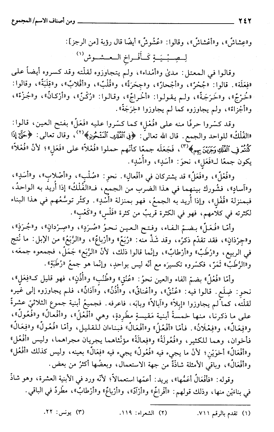 وأمّا "فُعُلٌ" بضمّ الفاء والعين نحوُ: "عُنُقٍ" و"طُنُبٍ" و"أُذُنٍ"، فهو قليل كـ"فِعَلٍ"، نحوِ: ضِلَع. قالوا فيه: "عُنُقٌ"، و"أعْناقٌ"، و"أُذُنٌ"، و"آذانٌ"، فلم يجاوزوه إلى غيره لقلّته، كما لم يجاوزوا "إبِلًا" و"آبالًا" وبابَه فاعرفه. فجميعُ أبنية جموع الثلاثيّ عشرةٌ على ما ذكرنا، منها خمسةُ أبنية مَقيسةٍ مطّرِدةٍ، وهي "أفْعُلُ"، و"أفْعالٌ" و"فُعُولٌ"، و"فِعالٌ"، و"فِعْلانُ". فأمّا "أفْعُلُ" و"أفْعالٌ" فبناءان للقليل، وأمّا "فُعُولٌ" و"فِعالٌ" فأخوان، وهما للكثير، و"فُعُولَةُ" و"فِعالَةُ" مؤنَّثاهما يجريان مجراهما، وليس "أفْعُل" و"أفْعَالٌ" أخوَيْنِ؛ لأنّ ما يجيء فيه "فُعُولٌ" يجيء فيه "فِعَالٌ" بعينه، وليس كذلك "أفْعُل" و"أفْعالٌ"، وباقي الأمثلة شاذّةٌ من جهة الاستعمال، وبعضُها أكثرُ من بعض.
