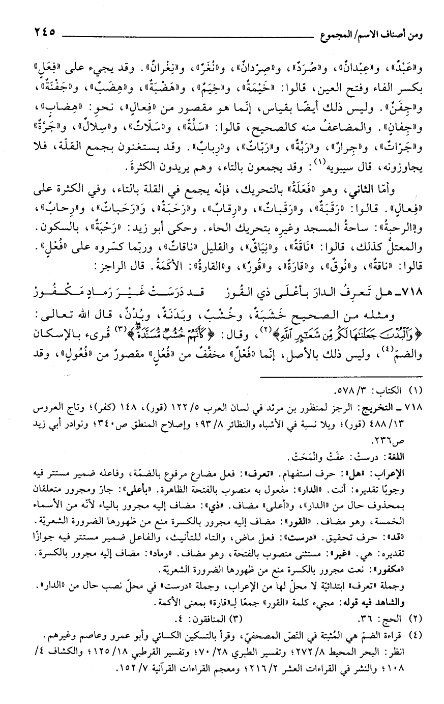 718 - التخريج: الرجز لمنظور بن مرثد في لسان العرب 5/ 122 (قور)، 148 (كفر)؛ وتاج العروس 13/ 488 (قور)؛ وبلا نسبة في الأشباه والنظائر 8/ 93؛ واصلاح المنطق ص 340؛ ونوادر أبي زيد ص 236.