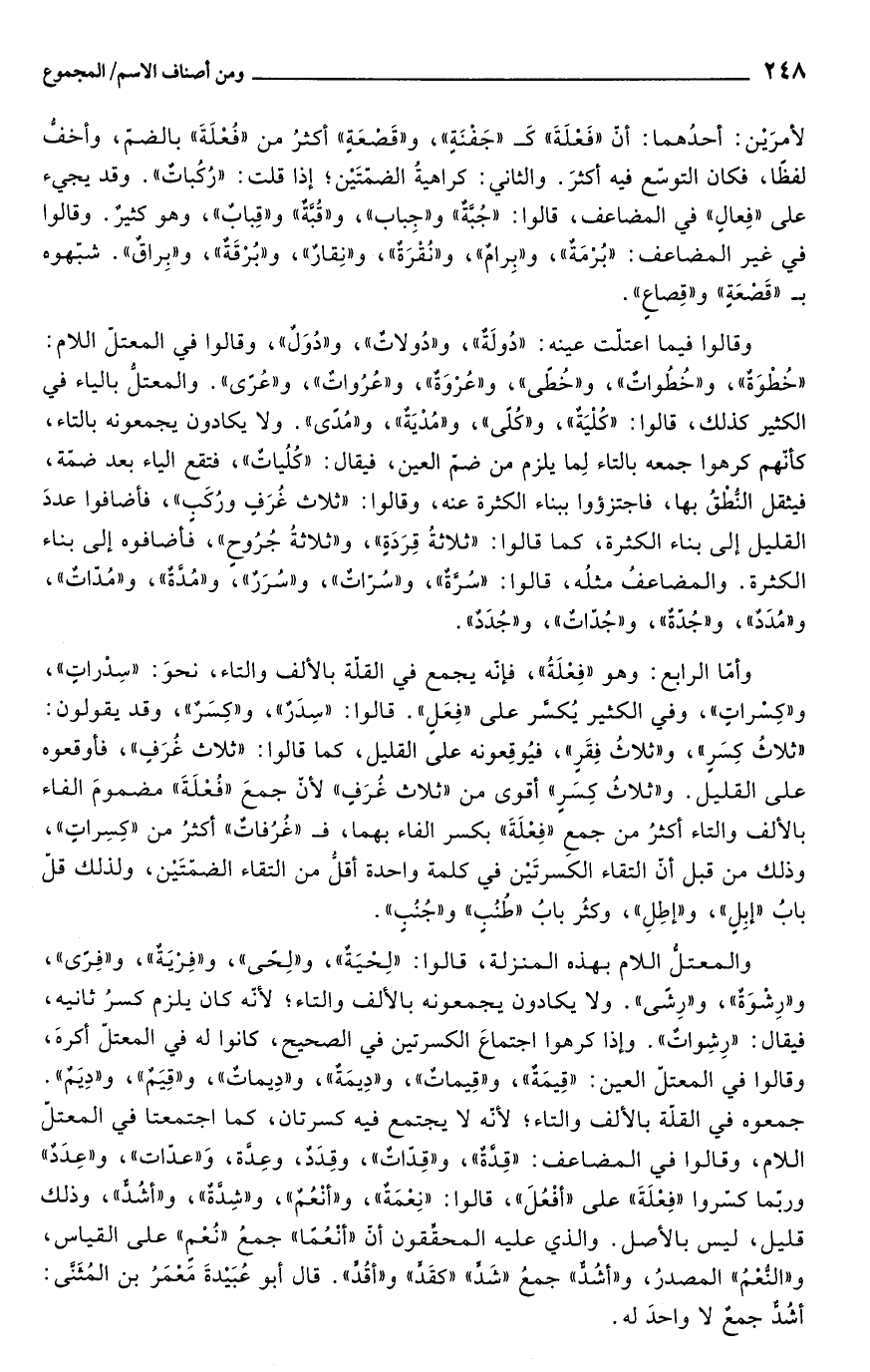 وقالوا فيما اعتلّت عينه: "دُولَةٌ"، و"دُولاتٌ"، و"دُوَلٌ"، وقالوا في المعتلّ اللام: "خُطْوَةٌ"، و"خُطُواتٌ"، و"خُطى"، و"عُرْوَةٌ"، و"عُرُواتٌ"، و"عُرًى". والمعتلُّ بالياء في الكثير كذلك، قالوا: "كُلْيَةٌ"، و"كُلًى"، و"مُدْيَةٌ"، و"مُدًى". ولا يكادون يجمعونه بالتاء، كأنّهم كرهوا جمعه بالتاء لِما يلزم من ضمّ العين، فيقال: "كُلُياتٌ"، فتقع الياء بعد ضمّة، فيثقل النُّطْقُ بها، فاجتزؤوا ببناء الكثرة عنه، وقالوا: "ثلاث غُرَفٍ ورُكَبٍ"، فأضافوا عدد القليل إلى بناء الكثرة، كما قالوا: "ثلائةُ قِرَدَةٍ"، و"ثلاثةُ جُرُوحٍ"، فأضافوه إلى بناء الكثرة. والمضاعفُ مثلُه، قالوا: "سُرَّةٌ"، و"سُرّاتٌ"، و"سُرَرٌ"، و"مُدَّةٌ"، و"مُدّاتٌ"، و"مُدَدٌ"، و"جُدّةٌ"، و"جُدّاتٌ"، و"جُدَدٌ".