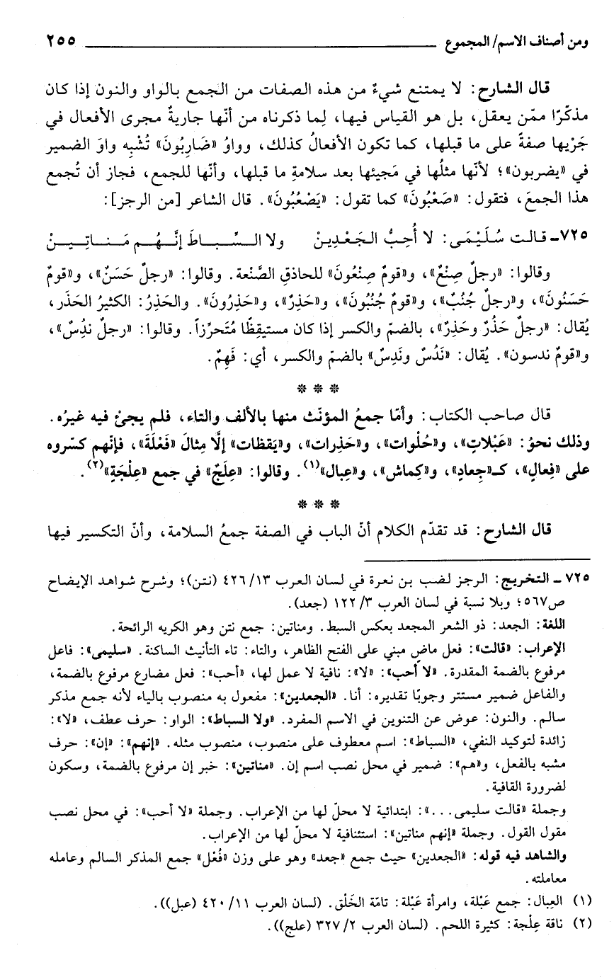 قال الشارح: لا يمتنع شيءٌ من هذه الصفات من الجمع بالواو والنون إذا كان مذكّرًا ممّن يعقل، بل هو القياس فيها، لِما ذكرناه من أنّها جاريةٌ مجرى الأفعال في جَرْيها صفة على ما قبلها، كما تكون الأفعالُ كذلك، وواوُ "ضَارِبُونَ" تُشْبِه واوَ الضمير في "يضربون"؛ لأنها مثلُها في مَجيئها بعد سلامةٍ ما قبلها، وأنّها للجمع، فجاز أن تُجمع هذا الجمعَ، فتقول: "صَعْبُونَ" كما تقول: "يَضعُبُونَ". قال الشاعر [من الرجز]: