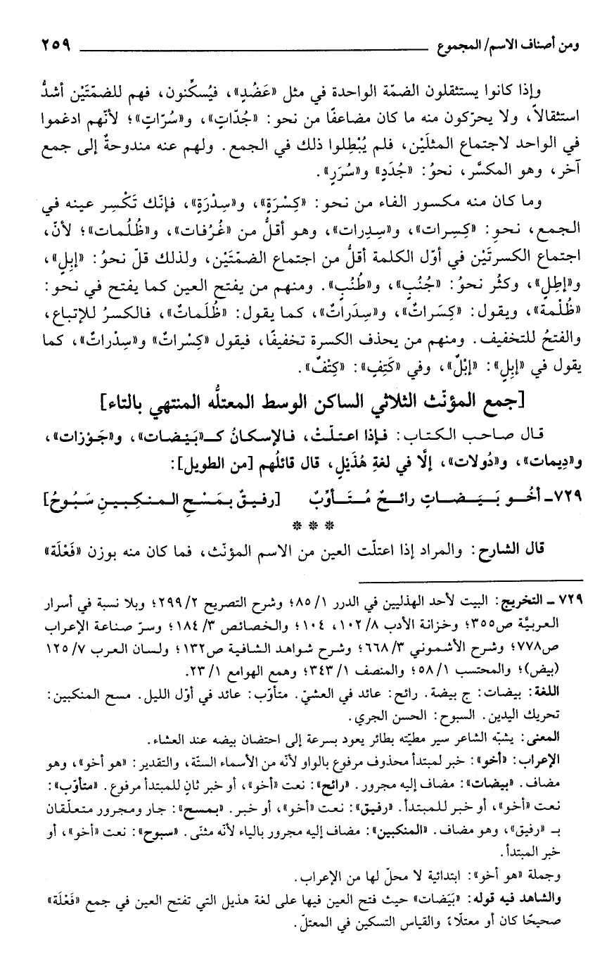 729 - التخريج: البيت لأحد الهذليين في الدرر 1/ 85؛ وشرح التصريح 2/ 299؛ وبلا نسبة في أسرار العربية ص 355؛ وخزانة الأدب 8/ 102، 104؛ والخصائص 3/ 184؛ وسرّ صناعة الإعراب ص 778؛ وشرح الأشموني 3/ 668؛ وشرح شواهد الشافية ص 132؛ ولسان العرب 7/ 125 (بيض)؛ والمحتسب 1/ 58؛ والمنصف 1/ 343؛ وهمع الهوامع 1/ 23.