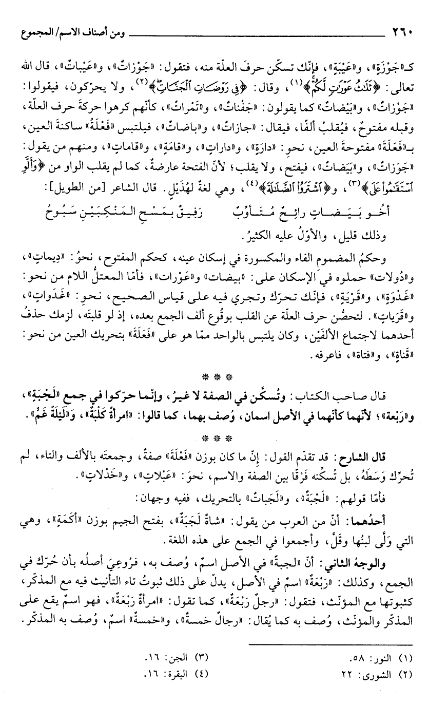 كـ"جَوْزَةٍ"، و"عَيْبَةٍ"، فإنّك تسكّن حرفَ العلّة منه، فتقول: "جَوْزاتٌ"، و"عَيْباتٌ"، قال الله تعالى: {ثَلَاثُ عَوْرَاتٍ لَكُمْ} (¬1)، وقال: {فِي رَوْضَاتِ الْجَنَّاتِ} (¬2)، ولا يحرّكون، فيقولوا: "جَوْزاتٌ"، و"بَيْضاتٌ" كما يقولون: "جَفْناتٌ"، و"تَمْراتٌ"، كأنهم كرهوا حركةَ حرف العلّة، وقبله مفتوحٌ، فيُقلبُ ألفًا، فيقال: "جازاتٌ"، و"باضاتٌ"، فيلتبس "فَعْلَةُ" ساكنةَ العين، بـ"فَعَلَةَ" مفتوحةَ العين، نحوِ: "دارَةٍ"، و"داراتٍ"، و"قامَةٍ"، و"قاماتٍ"، ومنهم من يقول: "جَوَزاتٌ"، و"بَيَضاتٌ"، فيفتح، ولا يقلب؛ لأنّ الفتحة عارضةٌ، كما لم يقلب الواو من {وَأَلَّوِ اسْتَقَامُوا عَلَى} (¬3)، و {اشْتَرَوُا الضَّلَالَةَ} (¬4)، وهي لغةٌ لهُذَيْلٍ. قال الشاعر [من الطويل]: