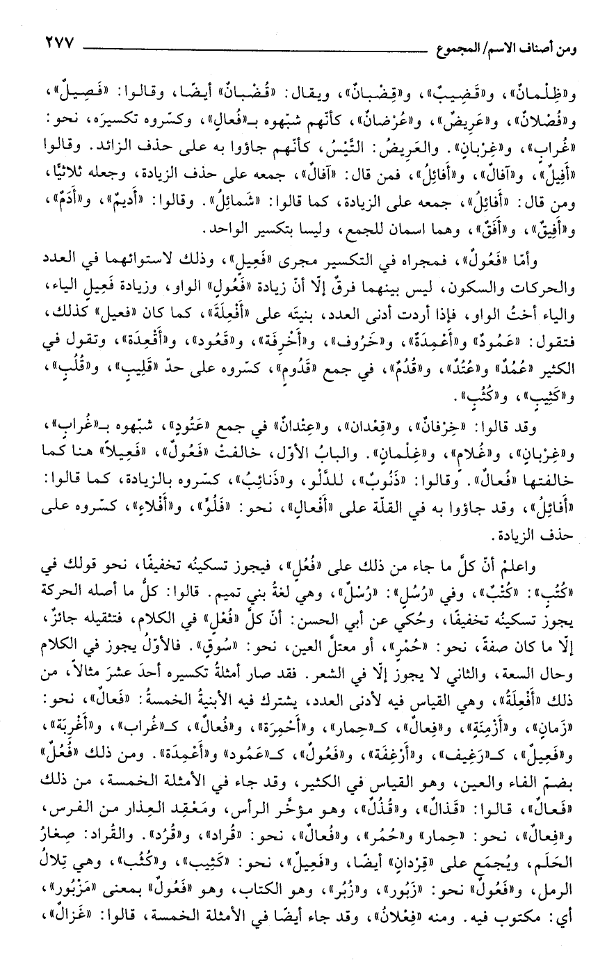واعلمْ أن كل ما جاء من ذلك على "فُعُلٍ"، فيجوز تسكينُه تخفيفًا، نحو قولك في "كُتُب": "كُتْبٌ"، وفي "رُسُل": "رُسْلٌ"، وهي لغةُ بني تميم. قالوا: كل ما أصله الحركة يجوز تسكينُه تخفيفًا، وحُكي عن أبي الحسن: أن كل "فُعل" في الكلام، فتثقيله جائزٌ، إلَّا ما كان صفة، نحو: "حُمْرٍ"، أو معتل العين، نحو: "سُوقٍ". فالأولُ يجوز في الكلام وحال السعة، والثاني لا يجوز إلَّا في الشعر. فقد صار أمثلةُ تكسيره أحدَ عشرَ مثالًا، من ذلك "أَفْعِلَةُ"، وهي القياس فيه لأدنى العدد، يشترك فيه الأبنيةُ الخمسةُ: "فَعالٌ"، نحو: "زَمانٍ"، و"أَزمِنَةٍ"، و"فِعال"، كـ"حِمار"، و"أَحْمِرَة"، و"فُعال"، كـ"غُراب"، و"أَغرِبَة"، و"فَعِيل"، كـ"رَغِيف"، و"أَرْغِفَة"، و"فَعُول"، كـ"عَمُود" و"أَعْمِدَة". ومن ذلك "فُعُل" بضم الفاء والعين، وهو القياس في الكثير، وقد جاء في الأمثلة الخمسة، من ذلك "فَعالٌ"، قالوا: "قَذالٌ"، و"قُذُلٌ"، وهو مؤخر الرأس، ومَعْقِد العِذار من الفرس، و"فِعالٌ"، نحو: "حِمار" و"حُمُر"، و"فُعال"، نحو: "قُراد"، و"قُرُد". والقُراد: صِغارُ الحَلَم، ويُجمَع على "قِرْدانٍ" أيضًا، و"فَعِيلٌ"، نحو: "كَثِيب"، و"كُثُب"، وهي تِلالُ الرمل، و"فَعُولٌ" نحو: "زَبُور"، و"زُبُر"، وهو الكتاب، وهو "فَعُولٌ" بمعنى "مَزبُور"، أي: مكتوب فيه. ومنه "فِعلانُ"، وقد جاء أيضًا في الأمثلة الخمسة، قالوا: "غَزالٌ"،