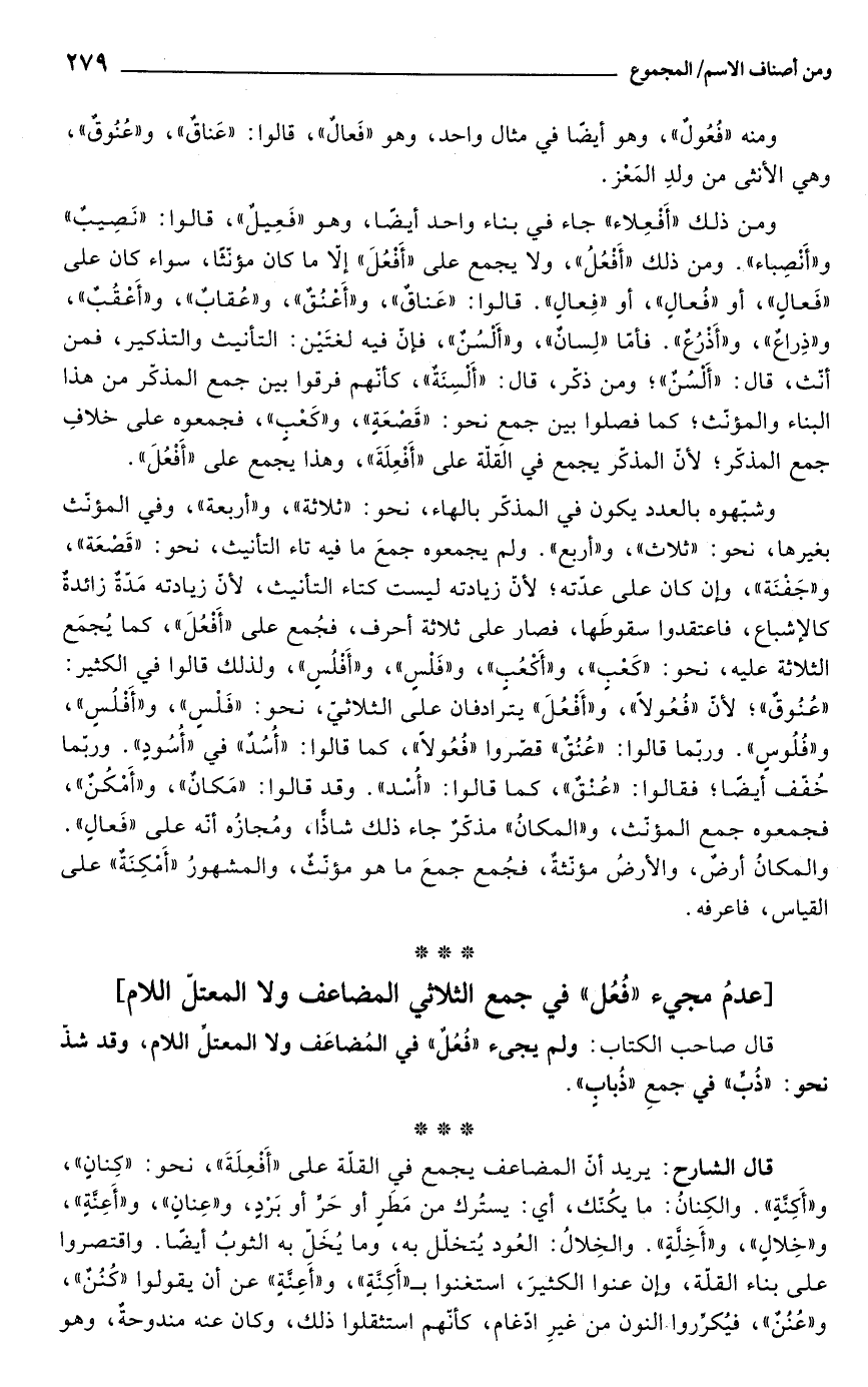 قال الشارح: يريد أنّ المضاعف يجمع في القلّة على "أفعِلَةَ"، نحو: "كِنانٍ"، و"أَكِّنَّةٍ". والكِنانُ: ما يكُنّك، أي: يستُرك من مَطَر أو حَرً أو بَرْدٍ، و"عِنانٍ"، و"أَعنهٍ"، و"خِلالٍ"، و"أخلةٍ". والخِلالُ: العُود يُتخلّل به، وما يُخَل به الثوبُ أيضًا. واقتصروا علي بناء القلة، وإن عنوا الكثيرَ، استغنوا بـ"أَكِنةٍ"، و"أَعنةٍ" عن أن يقولوا "كُنُنٌ"، و"عُنُنٌ"، فيُكرِّروا النون من غير ادّغام، كأنهم استثقلوا ذلك، وكان عنه مندوحةٌ، وهو