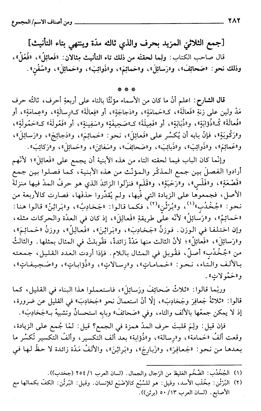 قال الشارح: اعلم أن ما كان من الأسماء مؤنثًا بالتاء على أربعةِ أحرف، ثالثُه حرف مَد ولين على رنةِ "فَعالَةَ"، كـ "حَمامَةٍ"، و"دَجاجَةٍ"، أو"فِعالَةَ" كـ "رِسالَةٍ"، و"عِمامَةِ"، أو "فُعالَةَ" كـ "ذُؤابَةٍ"، و"ذُبَابَةِ"، أو"فَعِيلَةَ" كـ"صَحِيفَةٍ" و"سَفِينةٍ"، أو"فَعُولَةَ" كـ "حَمُولَةٍ"، و"رَكُوبَة"، فإن بابه أن يُكسر على "فَعائِلَ"، نحو: "حَمائِمَ"، و"دَجائِجَ"، و"رَسائِلَ"، و"عَمائِمَ"، و"ذَوائِبَ"، و"ذَبائِبَ"، و"صَحائِفَ"، و"سَفائِنَ"، و"حَمائِلَ"، و"رَكائِبَ".