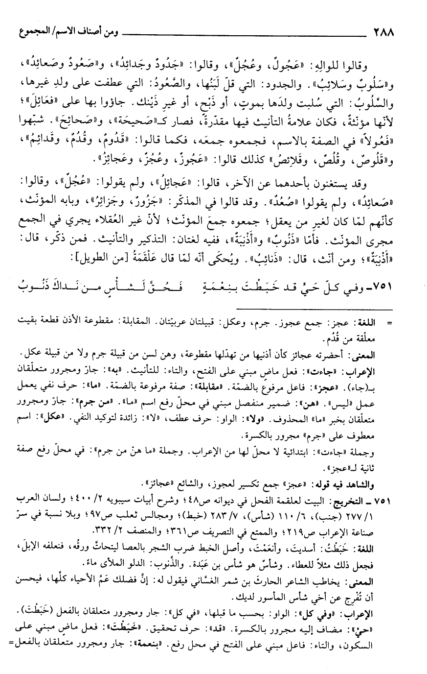 وقد يستغنون بأحدهما عن الآخر، قالوا: "عَجائِلُ"، ولم يقولوا: "عُجُلٌ"، وقالوا: "صَعائِدُ"، ولم يقولوا "صُعُدٌ". وقد قالوا في المذكر: "جَزُورٌ، وجَزائِرُ"، وبابه المؤنّث، كأنهم لما كان لغيرِ من يعقل؛ جمعوه جمعَ المؤنث؛ لأن غير العُقلاء يجري في الجمع مجرى المؤنّث. فأمّا "ذَنُوب" و"أَذْنِبَةٌ"، ففيه لغتان: التذكير والتأنيث. فمن ذكّر، قال: "أَذْنِبَة"؛ ومن أنث، قال: "ذَنائِبُ". ويُحكَى أنّه لمّا قال عَلْقَمَةُ [من الطويل]: