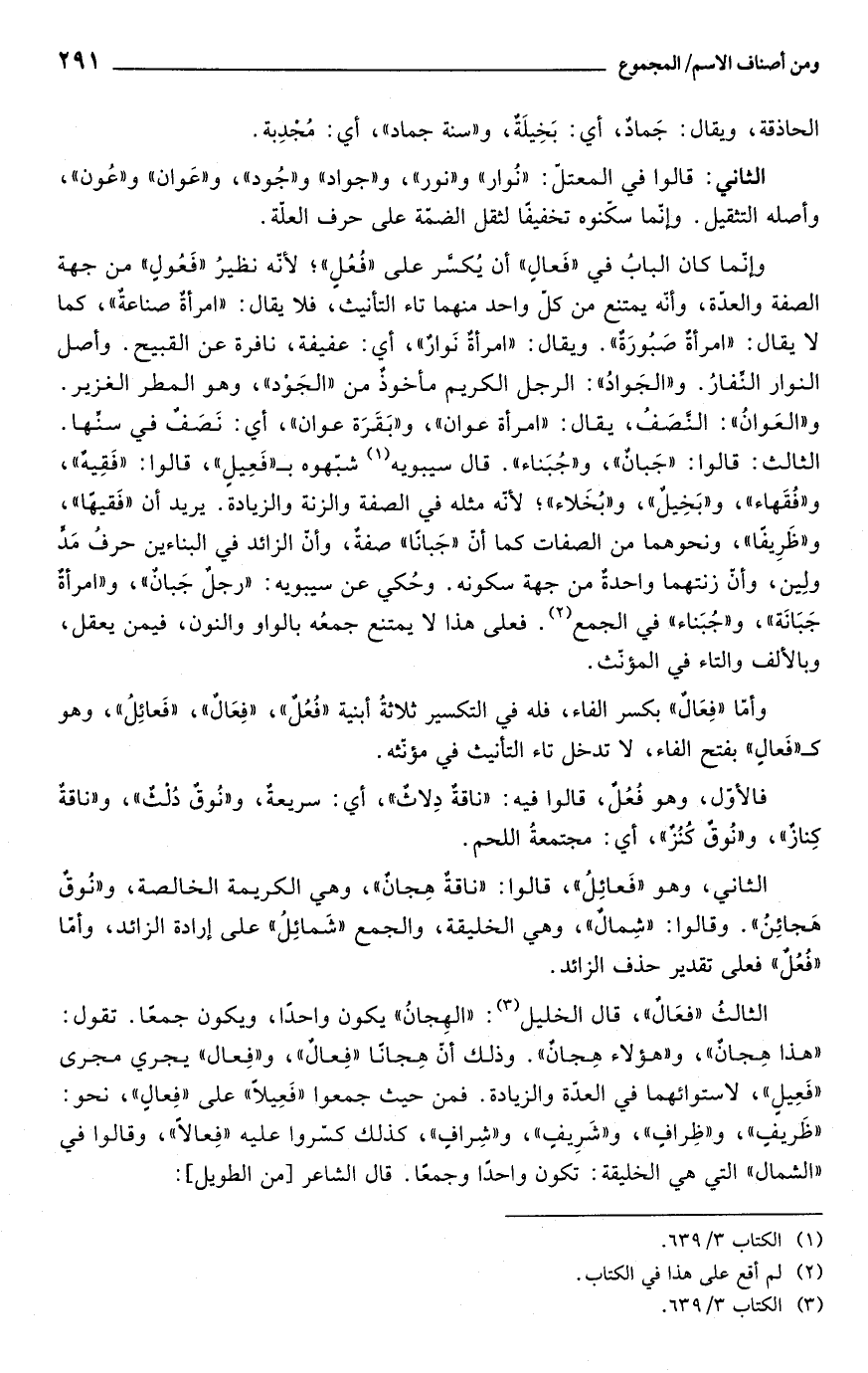 وإنما كان البابُ في "فَعالٍ" أن يُكسر على "فُعُلٍ"؛ لأنه نظيرُ "فَعُولٍ" من جهة الصفة والعدة، وأنه يمتنع من كل واحد منهما تاء التأنيث، فلا يقال: "امرأةٌ صناعةٌ"، كما لا يقال: "امرأة صَبُورَةٌ". ويقال: "امرأةٌ نَوارٌ"، أي: عفيفة، نافرة عن القبيح. وأصل النوار النفارُ. و"الجَوادُ": الرجل الكريم مأخوذٌ من "الجَوْد"، وهو المطر الغزير. و"العَوانُ": النصَفُ، يقال: "امرأة عوان"، و"بَقَرَة عوان"، أي: نَصَف في سنها. الثالث: قالوا: "جَبانٌ"، و"جُبَناء". قال سيبويه (¬1) شبهوه بـ "فَعِيل"، قالوا: "فَقِية"، و"فُقَهاء"، و"بَخِيلٌ"، و"بُخَلاء"؛ لأنه مثله في الصفة والزنة والزيادة. يريد أن "فَقيها"، و"ظَرِيفًا"، ونحوهما من الصفات كما أن "جَبانا" صفة، وأن الزائد في البناءين حرفُ مَد ولِين، وأن زنتهما واحدة من جهة سكونه. وحُكي عن سيبويه: "رجل جَبانٌ"، و"امرأةٌ جَبَانَة"، و"جُبَناء" في الجمع (¬2). فعلى هذا لا يمتنع جمعُه بالواو والنون، فيمن يعقل، وبالألف والتاء في المؤنّث.