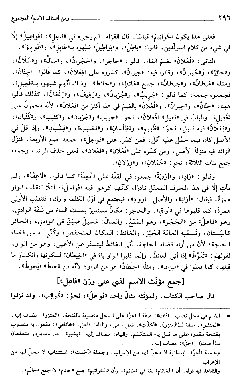 الثاني: "فُعلانُ" بضم الفاء، قالوا: "حاجر"، و"حُجرانٌ"، و"سالّ"، و"سُلانٌ"، و"حائِرٌ"، و"حُورانٌ"، وقالوا فيه: "حِيرانٌ"، كسروه على "فِعلانَ"، كما قالوا: "جِنانٌ"، ومثله "غِيطانٌ"، و"حِيطانٌ"، جمع "غائطِ"، و"حائط". وذلك أنهم شبهوه بـ"فَعِيل"، فجمعوه جمعه، كما قالوا: "جَرِيبٌ"، و"جُبانٌ"، و"رَغِيفٌ"، و"رُغفانٌ"، كذلك قالوا ها هنا: "جِنانٌ"، و"حِيرانٌ". و"فُعلانُ" بالضم في هذا أكثر من "فِعلانَ", لأنه محمول على"فَعِيل". والبابُ في "فعيل" "فُعلانُ"، نحو: "جريب" و"جُرْبان"، و"كثيب"، و"كُثبان"، و"فِعلانُ"، فيه قليل، نحوُ: "ظَلِيم"، و"ظِلمانٍ"، و"قضيب"، و"قِضبان". وإذا قل في الأصل كان فيما حمُل عليه أقل، فمن كسره على "فَواعِلَ"، جمعه جمع الأربعة، فنزل الزائدَ فيه منزلةَ الأصل، ومن كسره على "فُعلان" و"فِعلان"، فعلى حذف الزائد، وجمعه جمع بنات الثلاثة، نحوِ: "حُملانٍ"، و"وِرلانٍ".