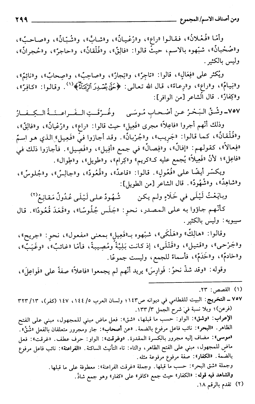 وأمّا "فُعْلانُ"، فقالوا "راع"، و"رُعْيانٌ"، و"شابٌ"، و"شُبان"، و"صاحبٌ"، و"صُحْبانٌ"، شبهوه بالاسم، حيث قالوا: "فالِقٌ"، و"فُلْقان"، و"حاجرٌ"، و"حُجرانٌ"، وليس بالكثير.